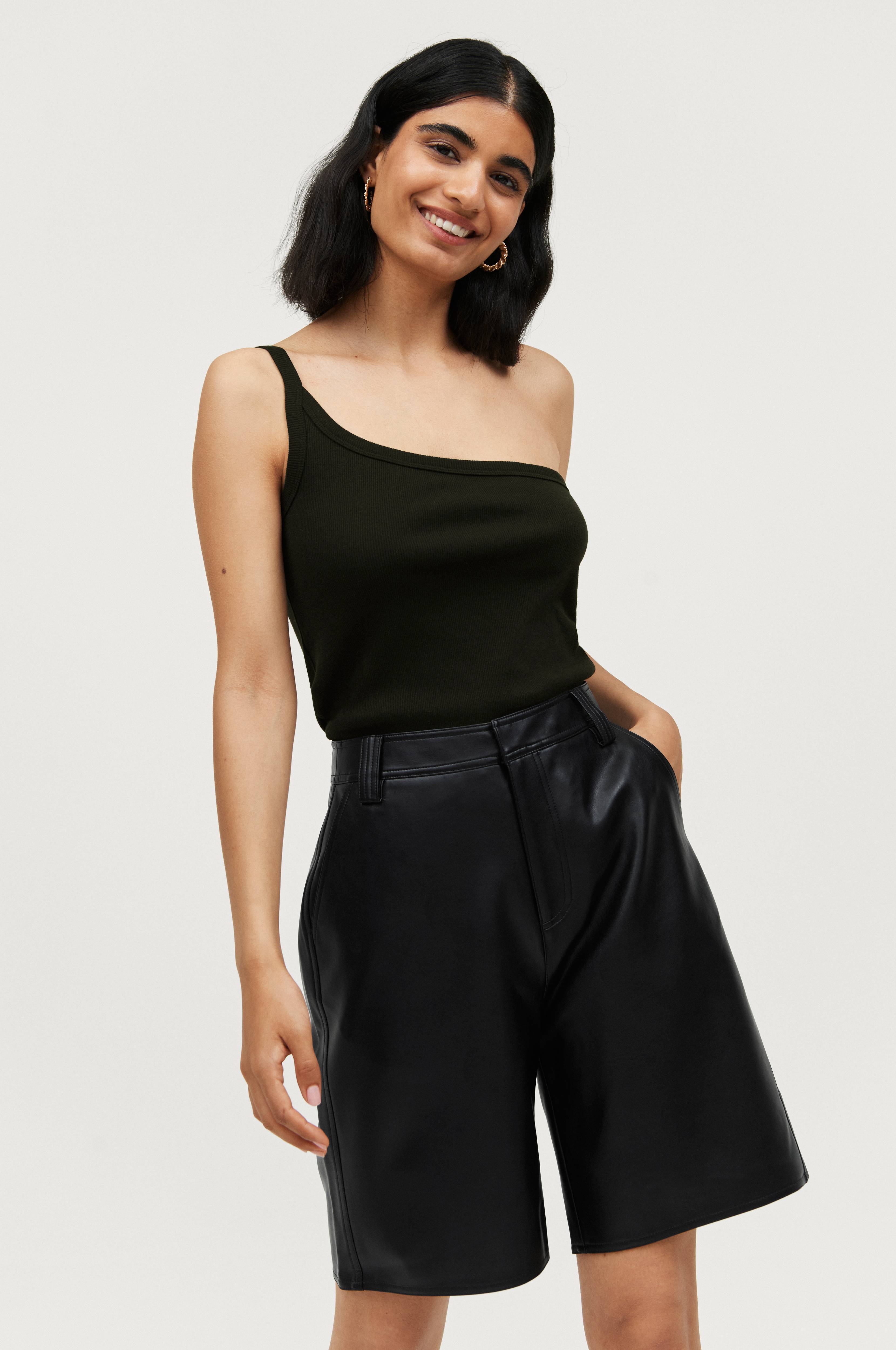 • Længere model• Lommer i siderne og bagpå• Lynlås• Hægtelukning ved taljen• Fremstillet af imiteret læder med et stræk