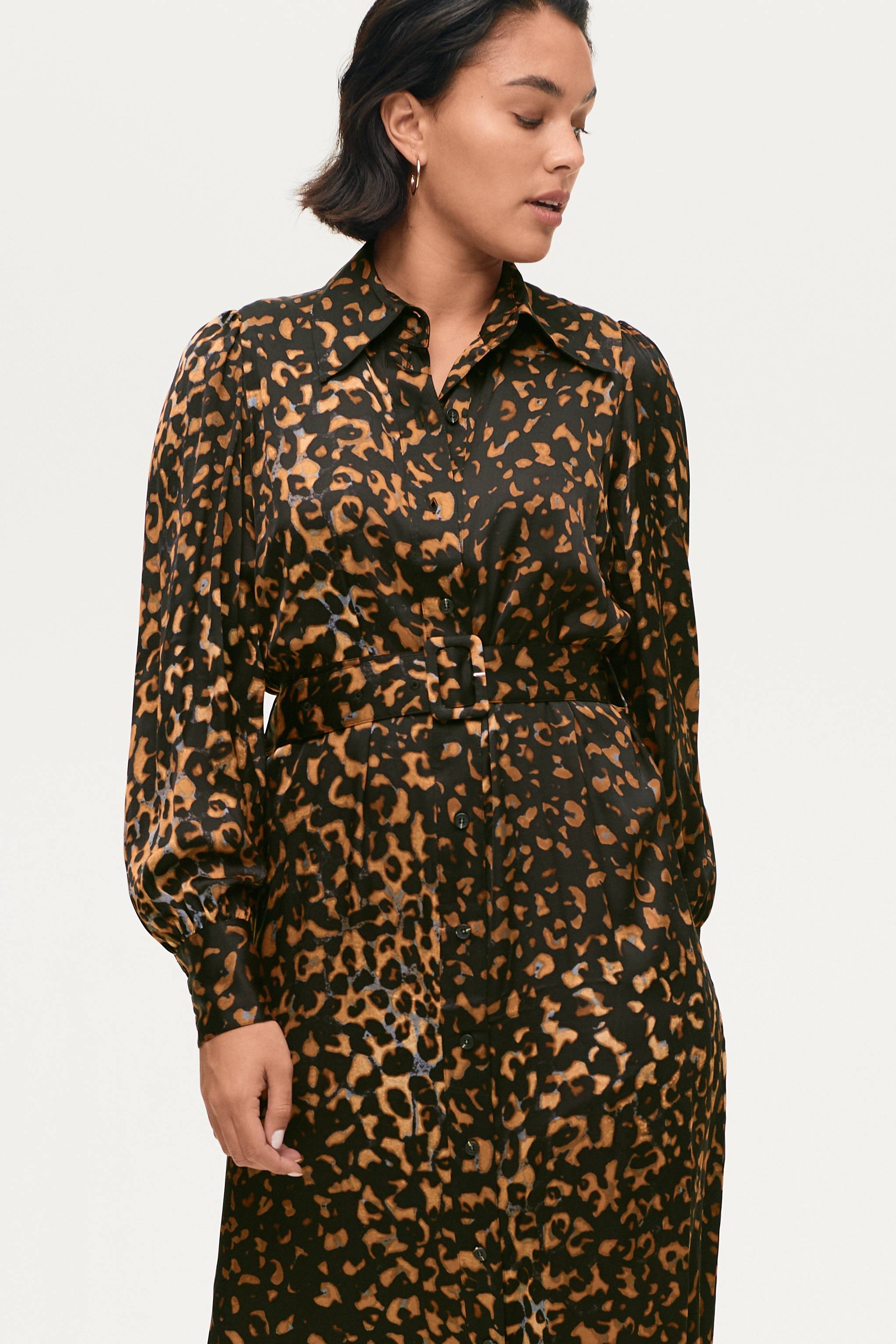 Skjortekjole Skyla Dress fra Twist & Tango. Let A-formet model i vævet satin med afskæring, stropper og bælte med beklædt spænde i taljen. Krave med lidt længere flipper og lukning hele vejen foran. Langt, vidt ærme med rynkning ved skulderen og bred manchet i ærmekant. Længde ca. 116 cm i str. 36.