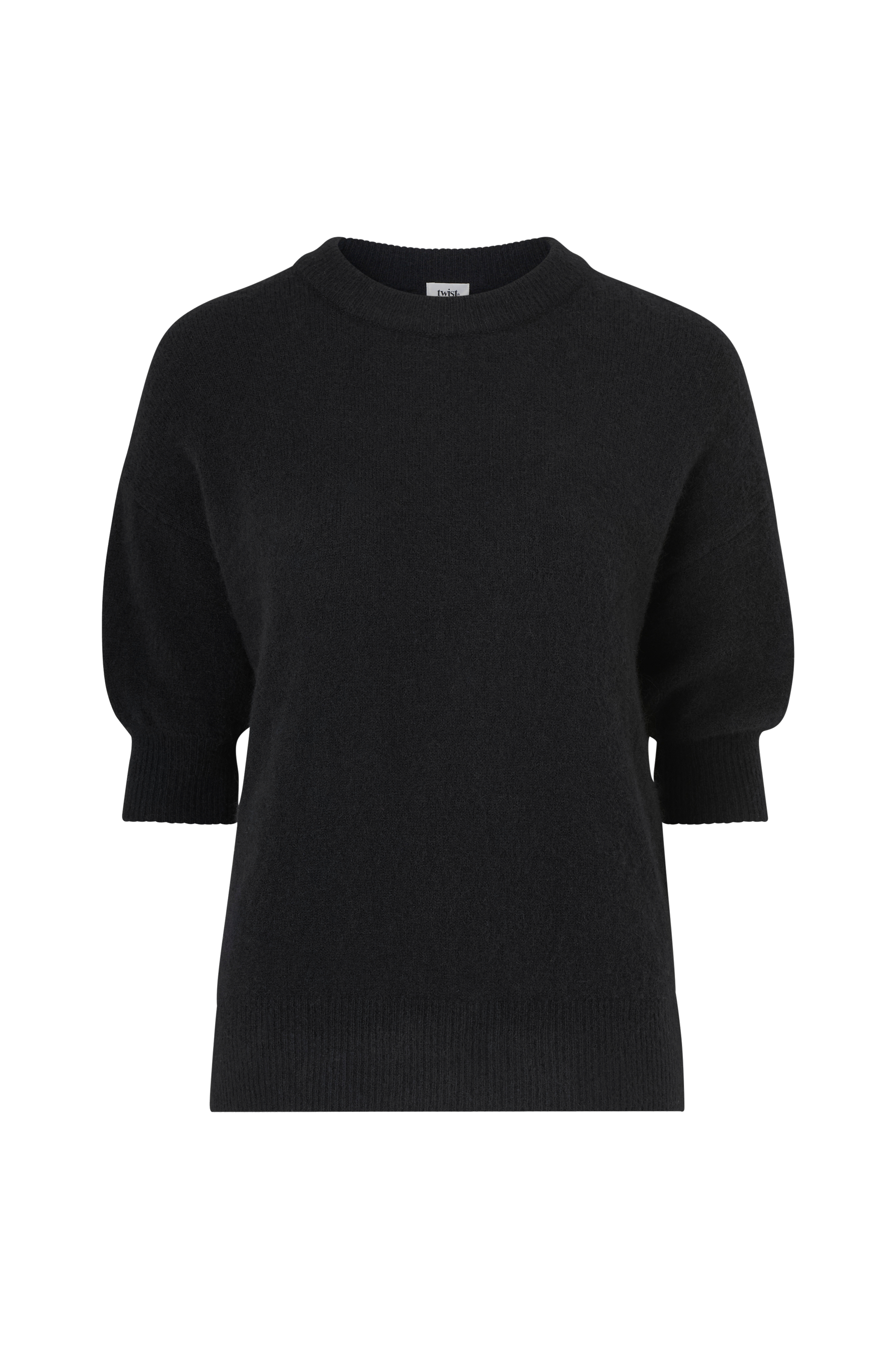 • Glatstrikket model• Rund hals med ribkant• Nedsænket skulder med kort ærme• Ribstrik ved nederste kant og ved manchetterne