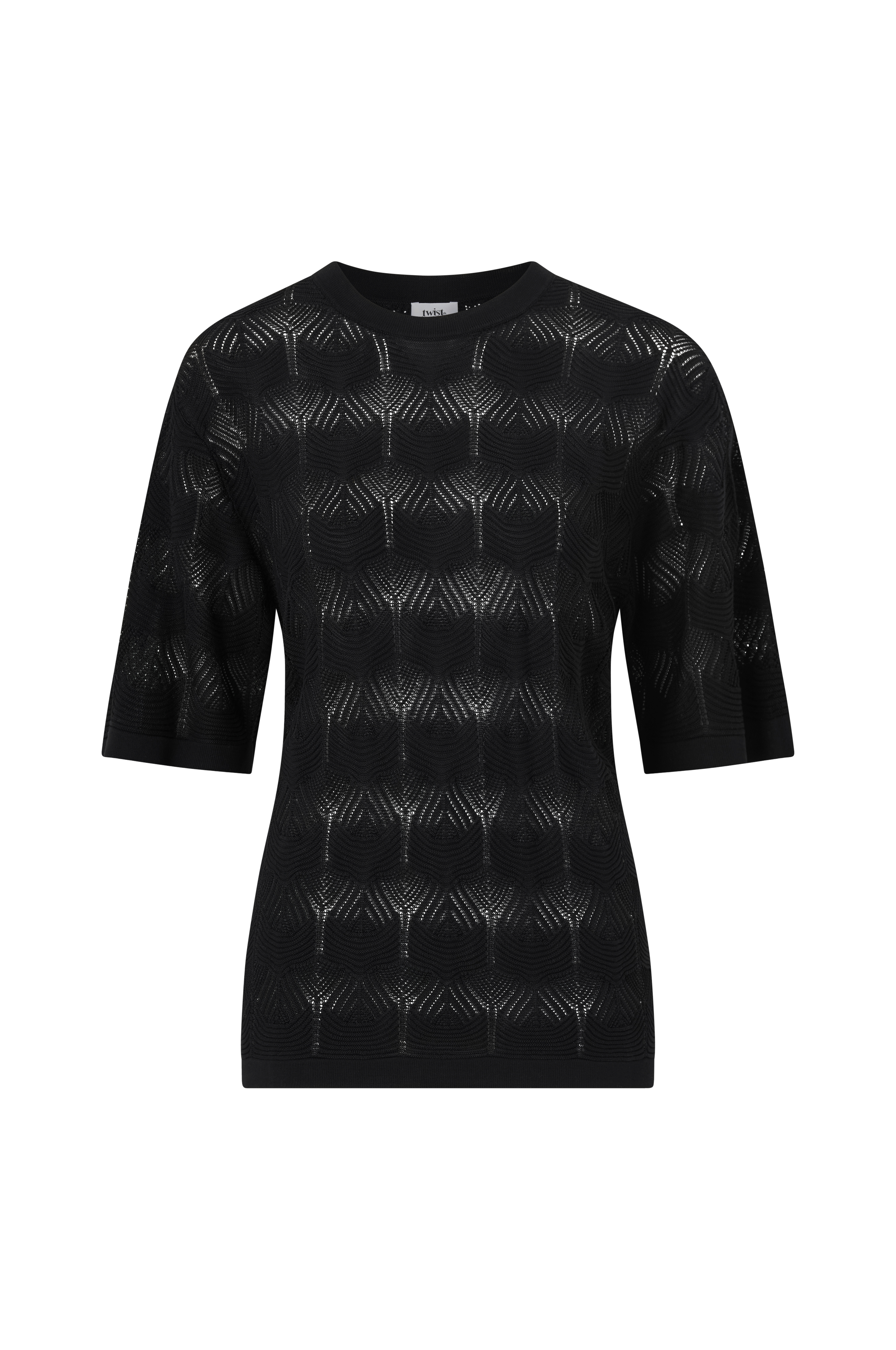• Mønsterstrikket trøje med hulmønster• Rund, ribbet halsudskæring• Halvlange ærmer• Ribstrik nederst og ved manchetterne