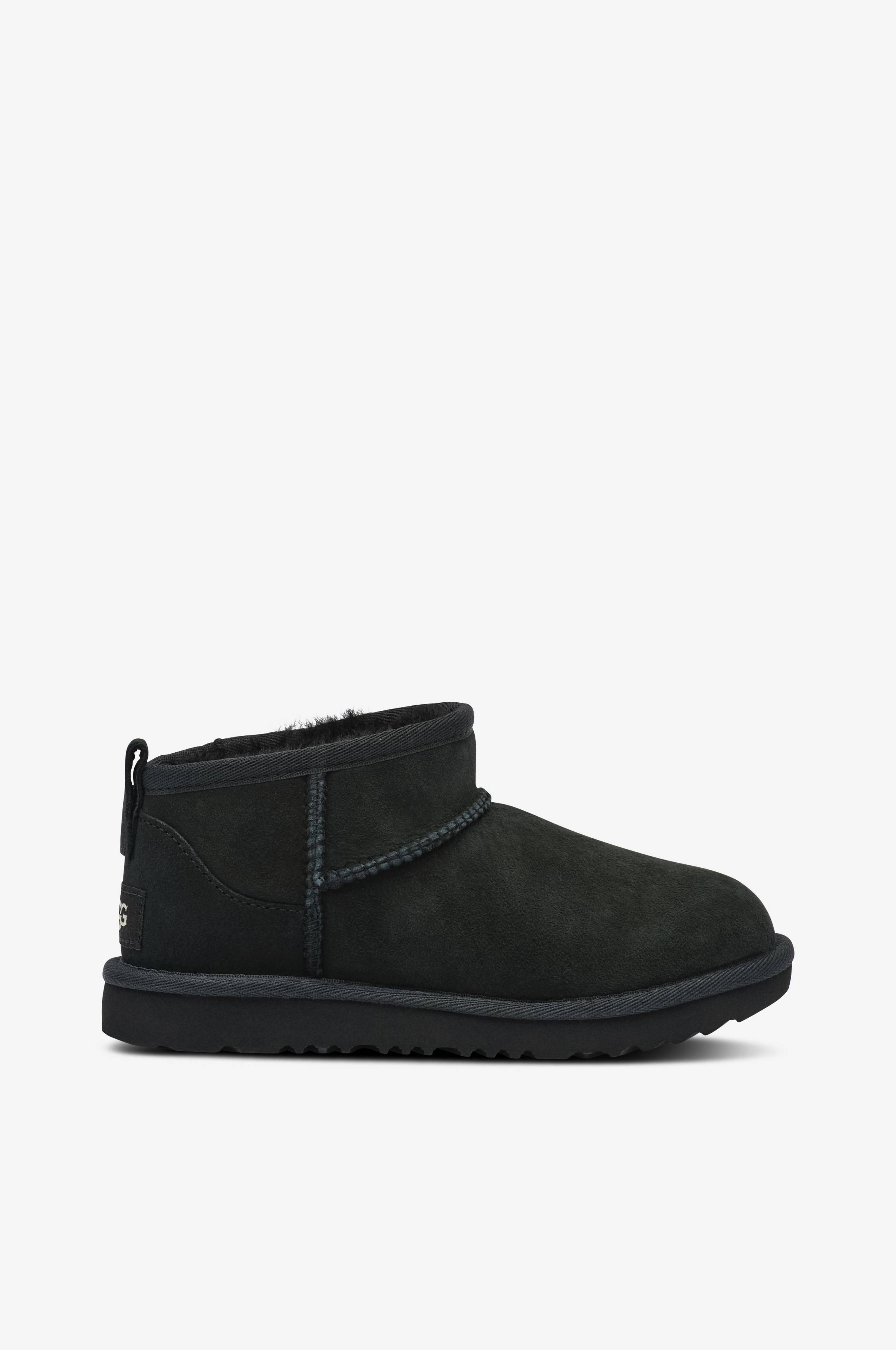 • Øvredel i ruskind• Kort skaft med vævet træksnor• For i fåreuld• Ydersål i gummi