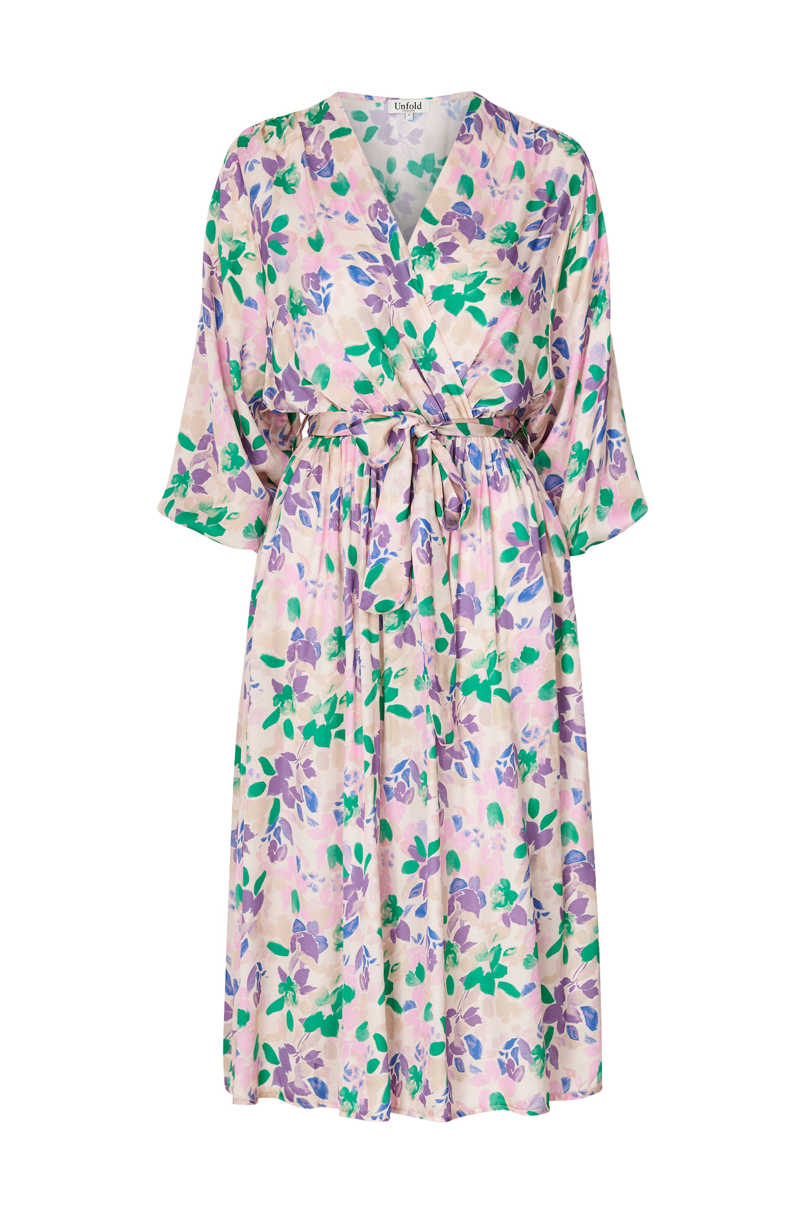 - V-udskæring med slå-om- Elastisk talje med bindebælte- Lange ballonærmer med elastisk ærmekant- Blank kvalitet- Længde: 108 cm i str. S