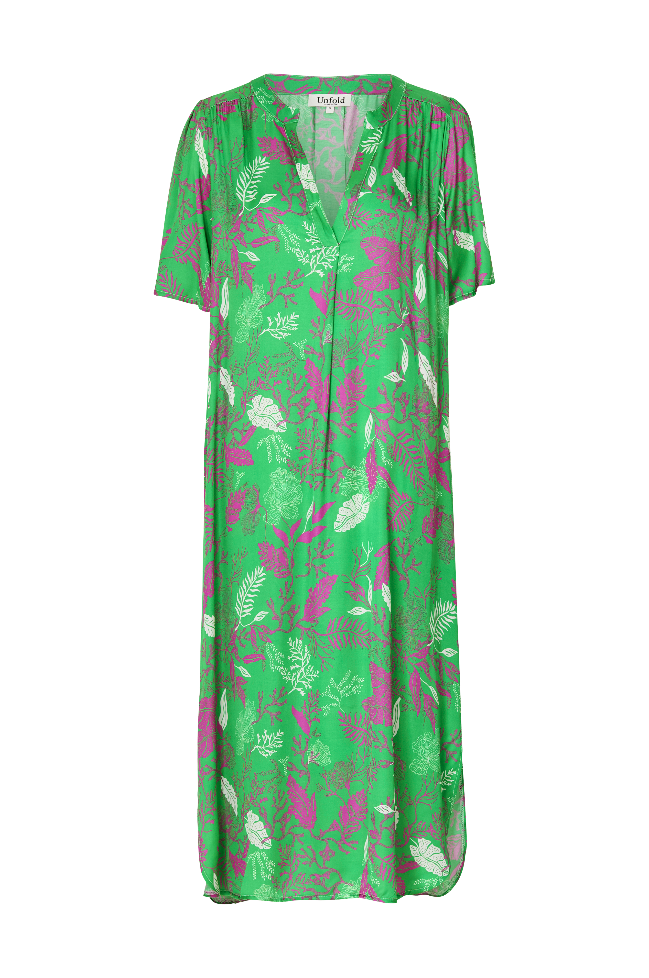 - A-formet model med løs form i satin- Rund hals med lille kant og v-udskæring foran- Korte, vide ærmer- Lagt læg på brystet- Afrundede slidser forneden i siderne- Længde 130 cm i str. S