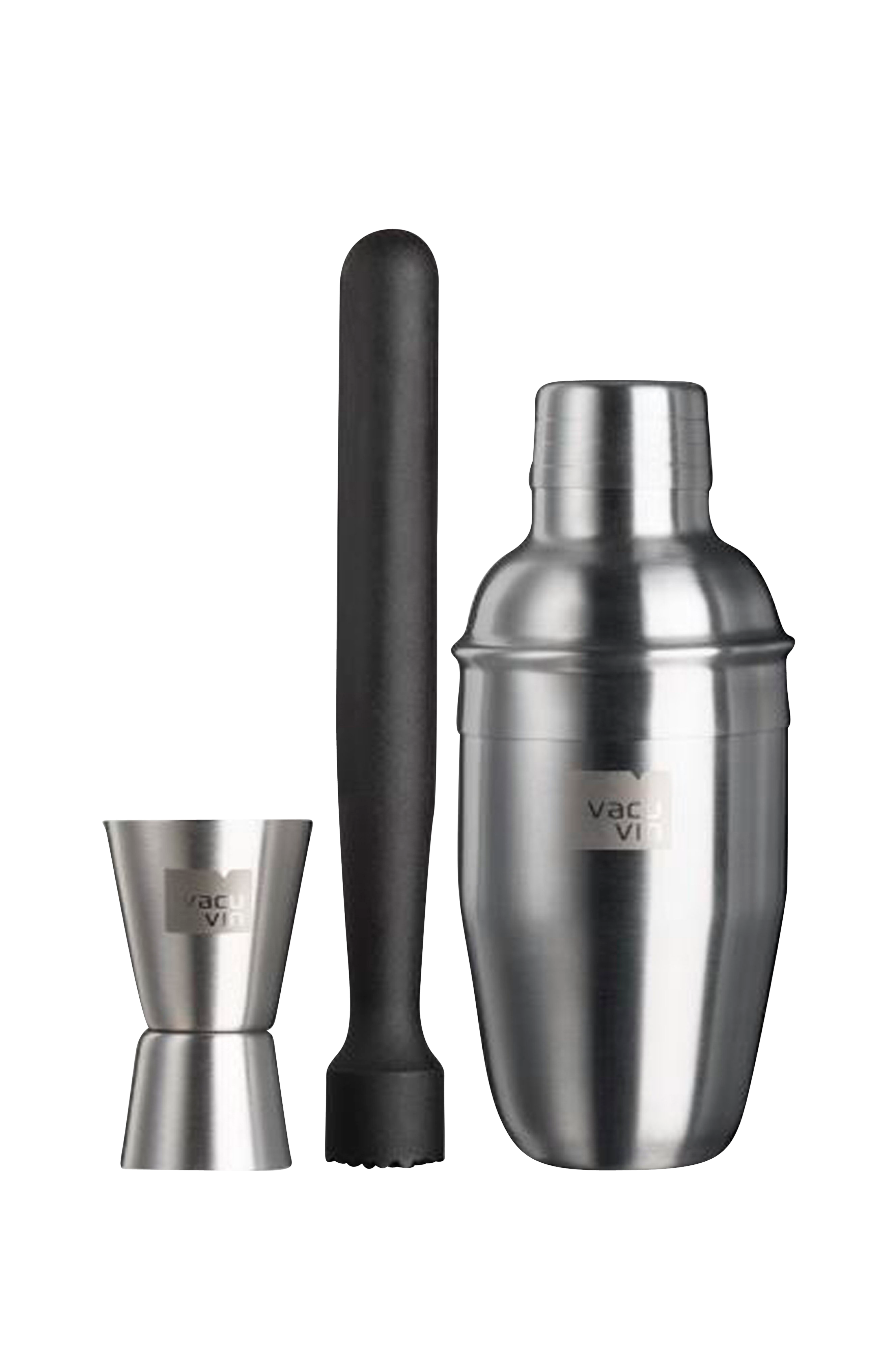 Dette cocktailsæt indeholder 3 vigtige redskaber til at lave dine yndlingscocktails eller blandede drinks. Det perfekte startsæt til den spirende cocktailelsker! Cocktailshaker (350 ml) med indbygget si til at blande en drink. Dobbelt måleglas (15-30 ml) til at afmåle 1 eller 1/2 del af spiritusingredienserne. Muddler til at knuse eller røre i frugt- og urteingredienser. Alt sammen pakket i en gaveæske
