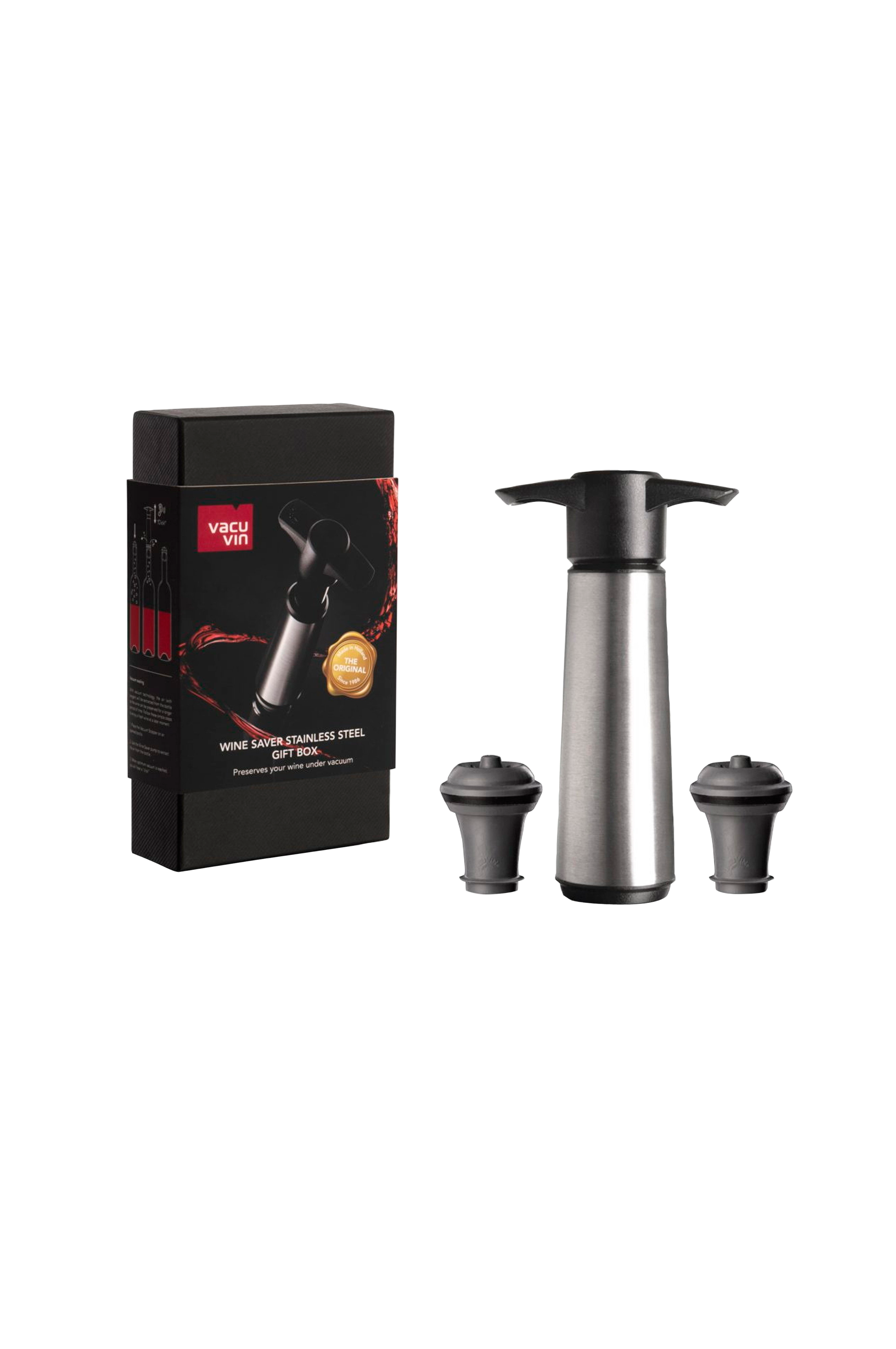 Wine Saver-pumpen suger luften ud af åbnede flasker og lukker dem igen med en genanvendelig gummiprop. Vakuummet bremser oxideringsprocessen, så vinen kan opbevares i længere tid. Placer vakuumproppen i flasken, og pump, indtil der lyder et "klik". Wine saver har sin oprindelse i den første version, der blev skabt i 1986. Wine saver concerto er designet med et ergonomisk og elegant greb wine saver stainless steel er premiumudgaven af originalen. Gaveemballage inkl. 2 propper