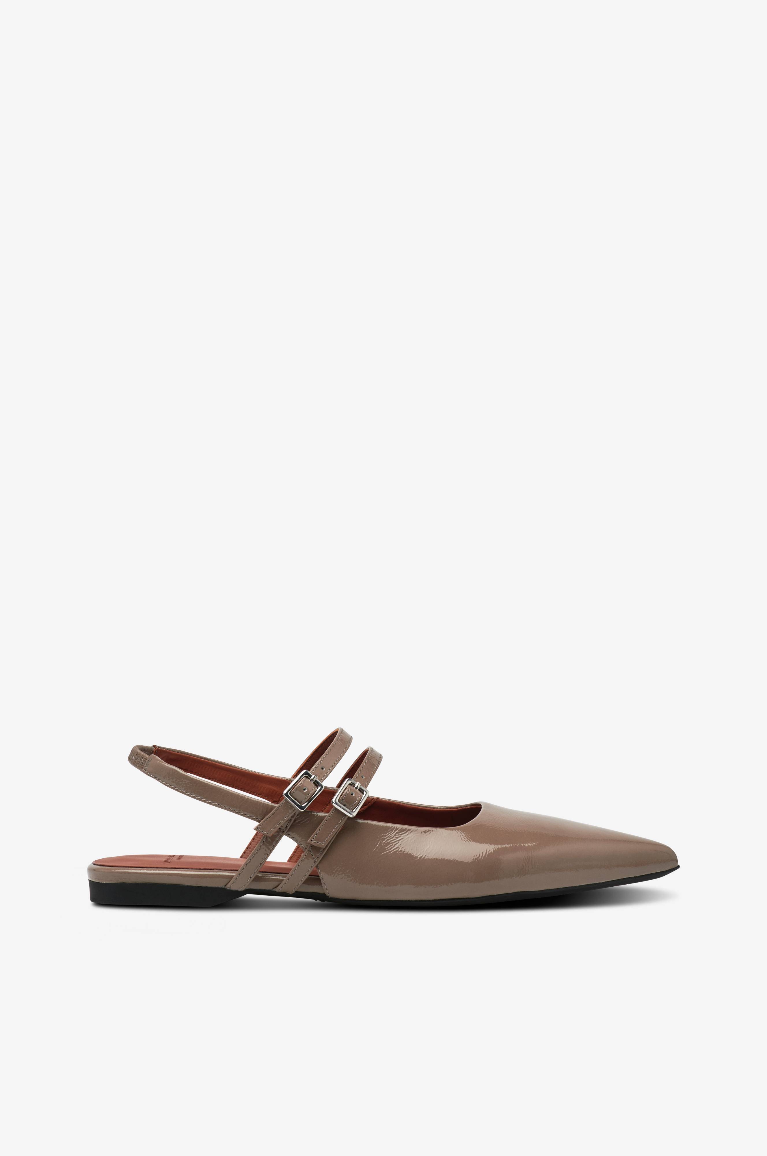 • Slingbacks i patent læder• Spids snude• To justérbare remme over foden• Elastisk hælrem