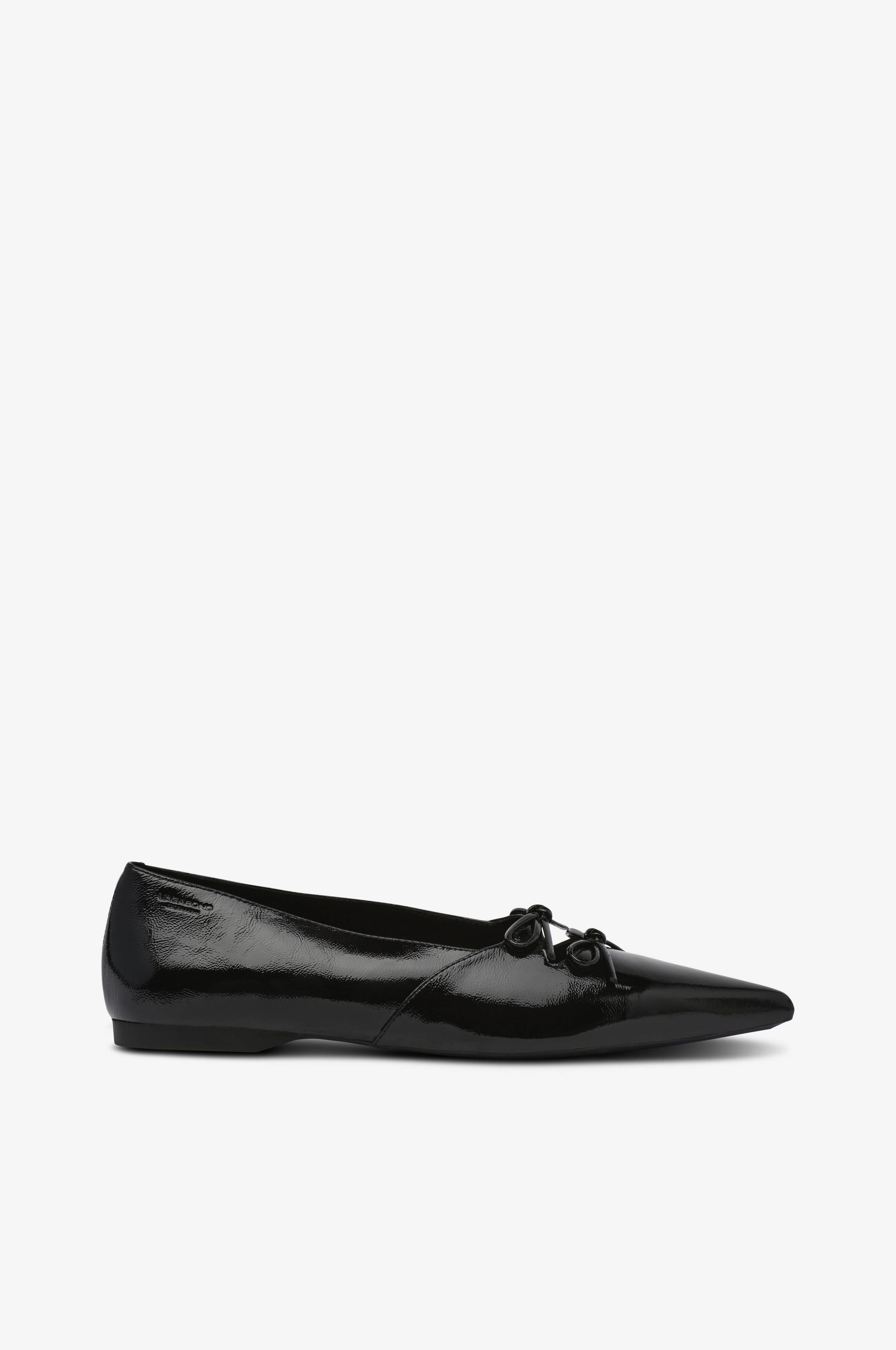 • Ballerinasko i lakeret, blankt læder• Spids tåform• Dekorative bånd forrest på foden• For i læder• Lav hæl• Fremstillet af gummi