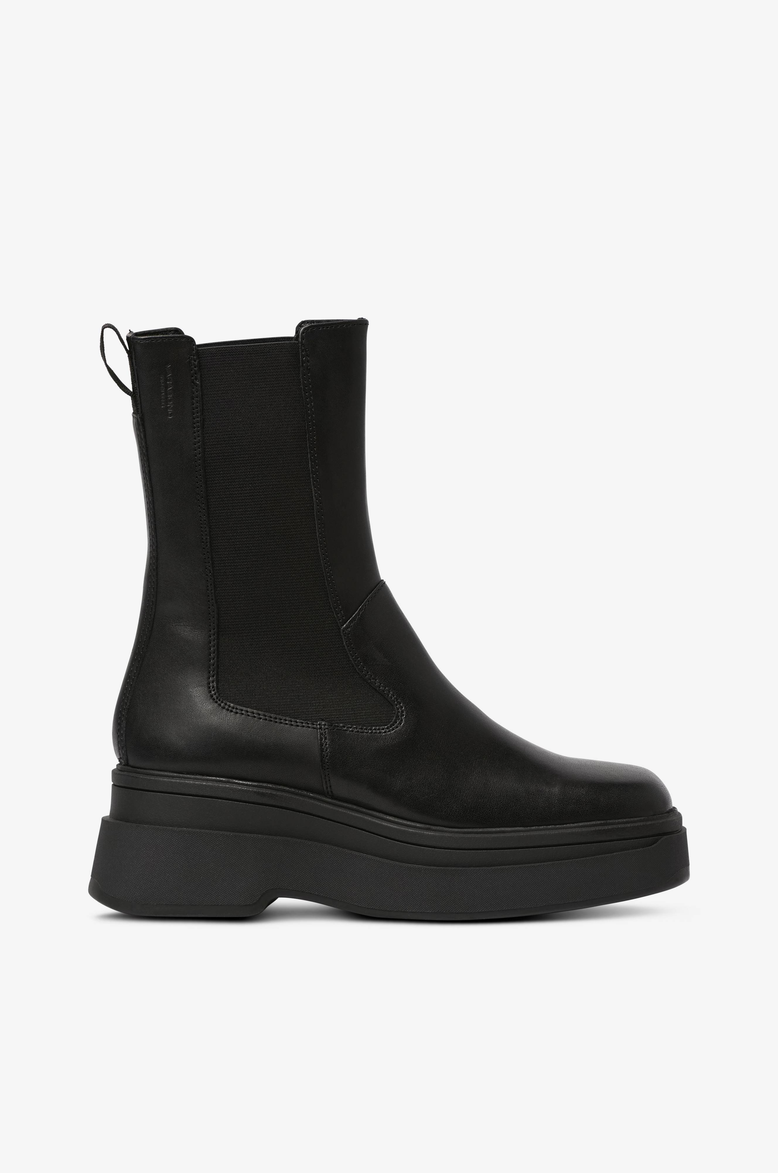 Boots af skind. Chelseamodel med høj sål, firkantet tåform og elastikindsatse på begge sider af skaftet. Vævet trækstrop bagpå. Hælhøjde ca. 6 cm, sålhøjde ca. 4,5 cm. Skafthøjde ca. 19 cm i str. 37.