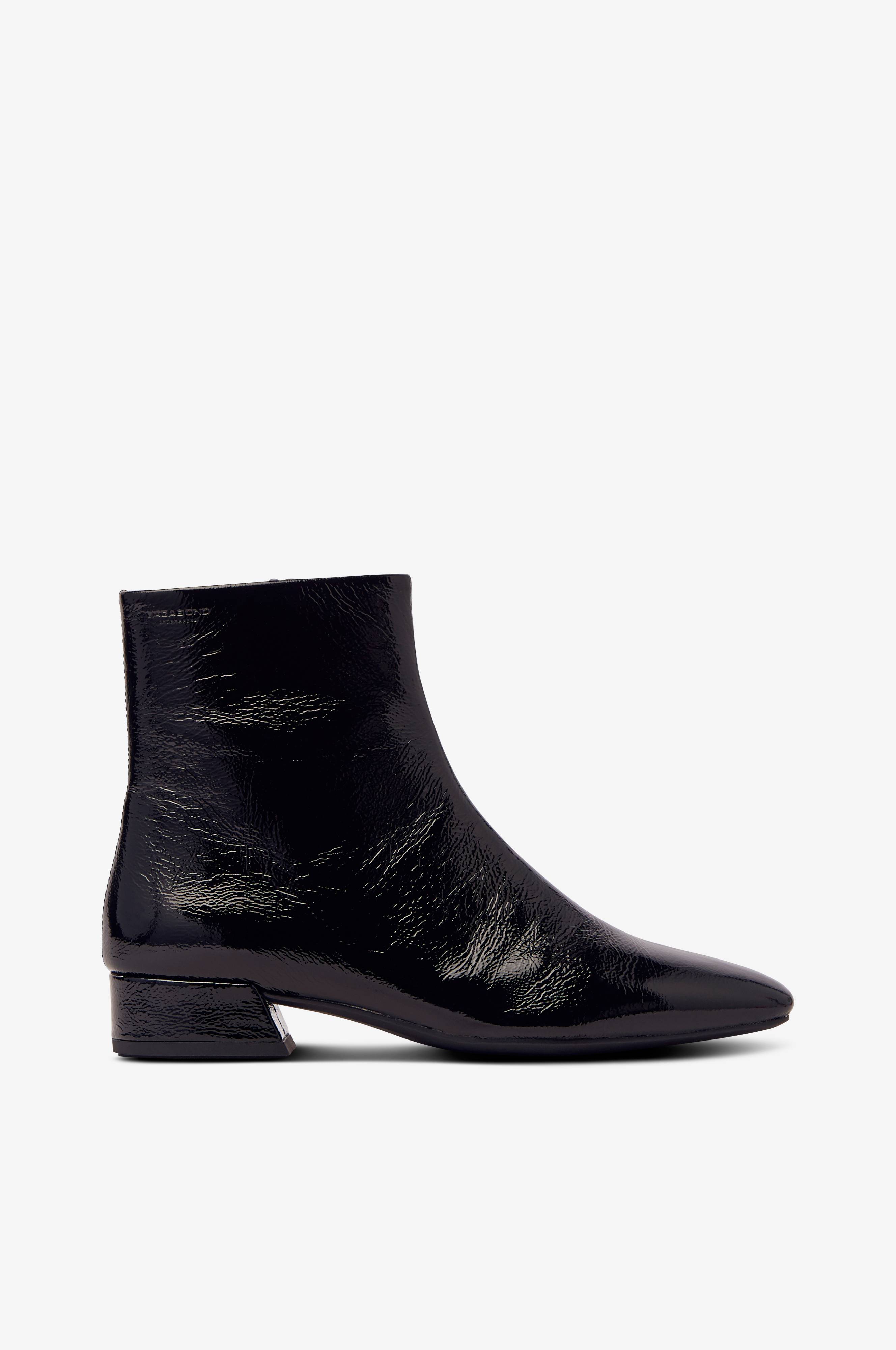 Boots Joyce fra Vagabond i lakeret læder med strukturoverflade. Lille beklædt hæl og mellemlangt skaft med lynlås på indersiden. Skafthøjde 14 cm, hælhøjde 3 cm.