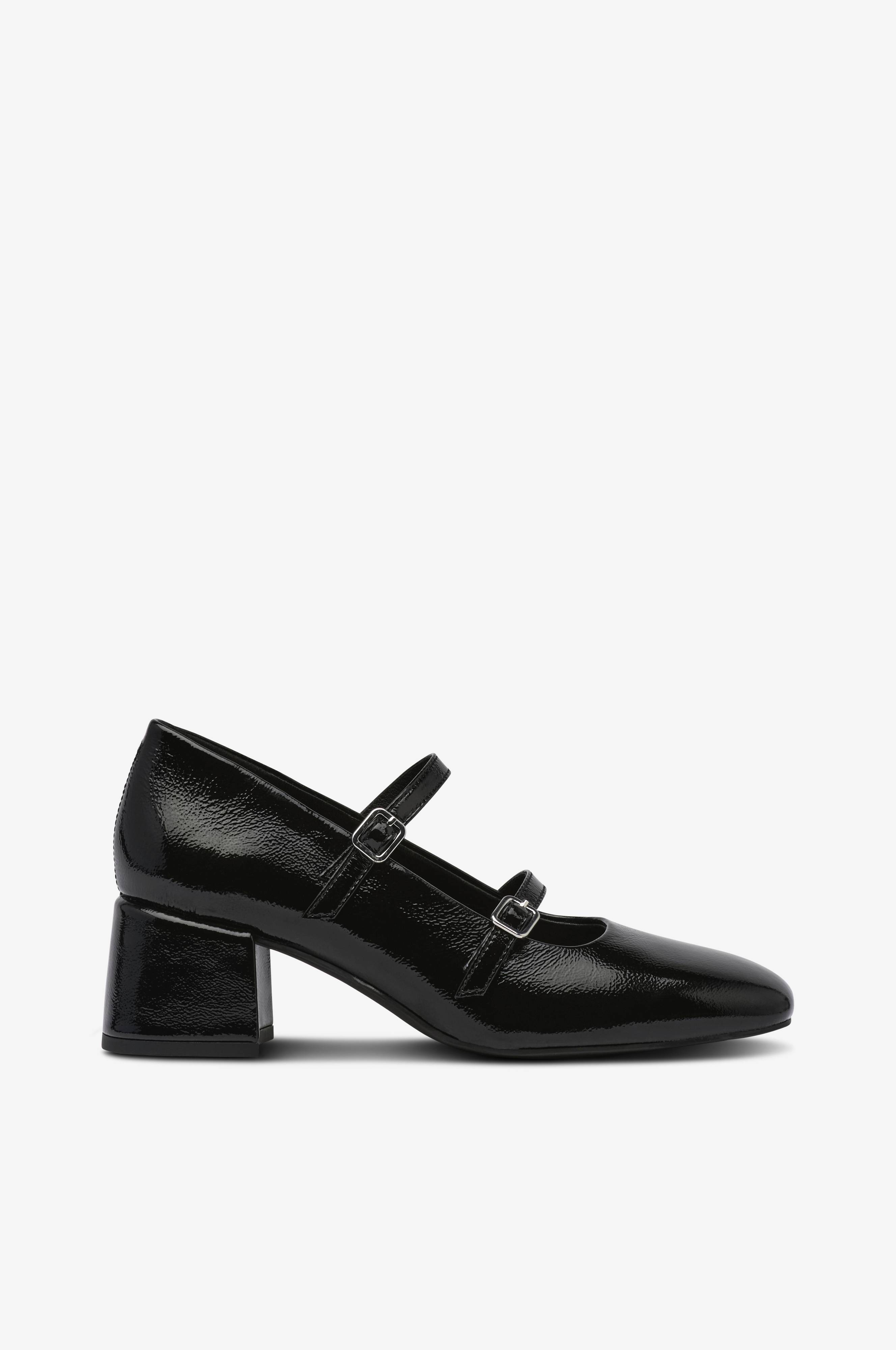 • Højhælet sko i patent læder med beklædt blokhæl• Dobbelte, justérbare remme med sølvfarvede spænder• Firkantet tåform• Læderbetrukket fodseng• Hælhøjde: 5,5 cm