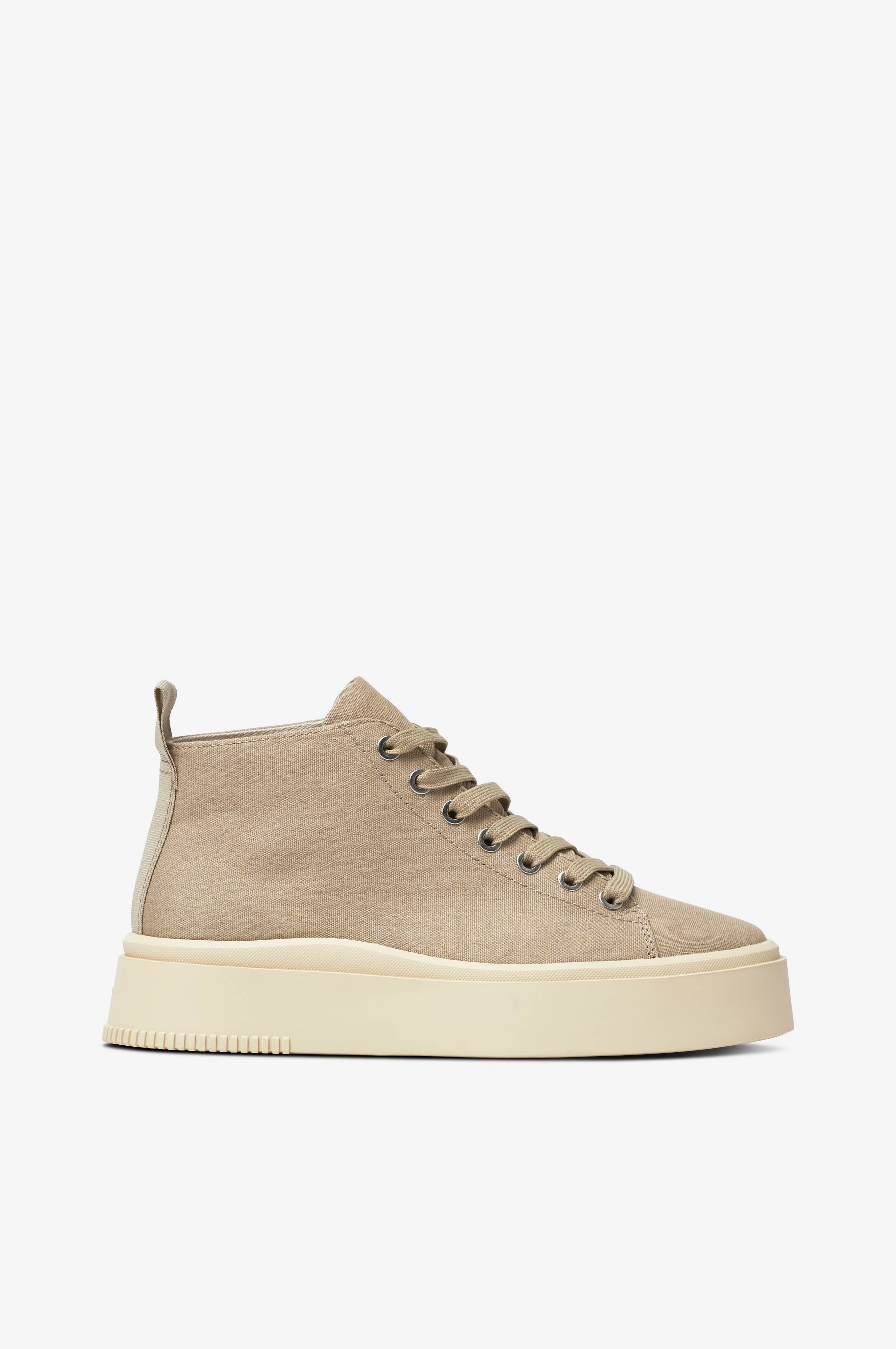 • Øvredel i bomuldsstof• Platformsål• Snøring• Vævet træksnor bagpå• Tekstilforing• Indersål i læder• Sålhøjde: 4 cm