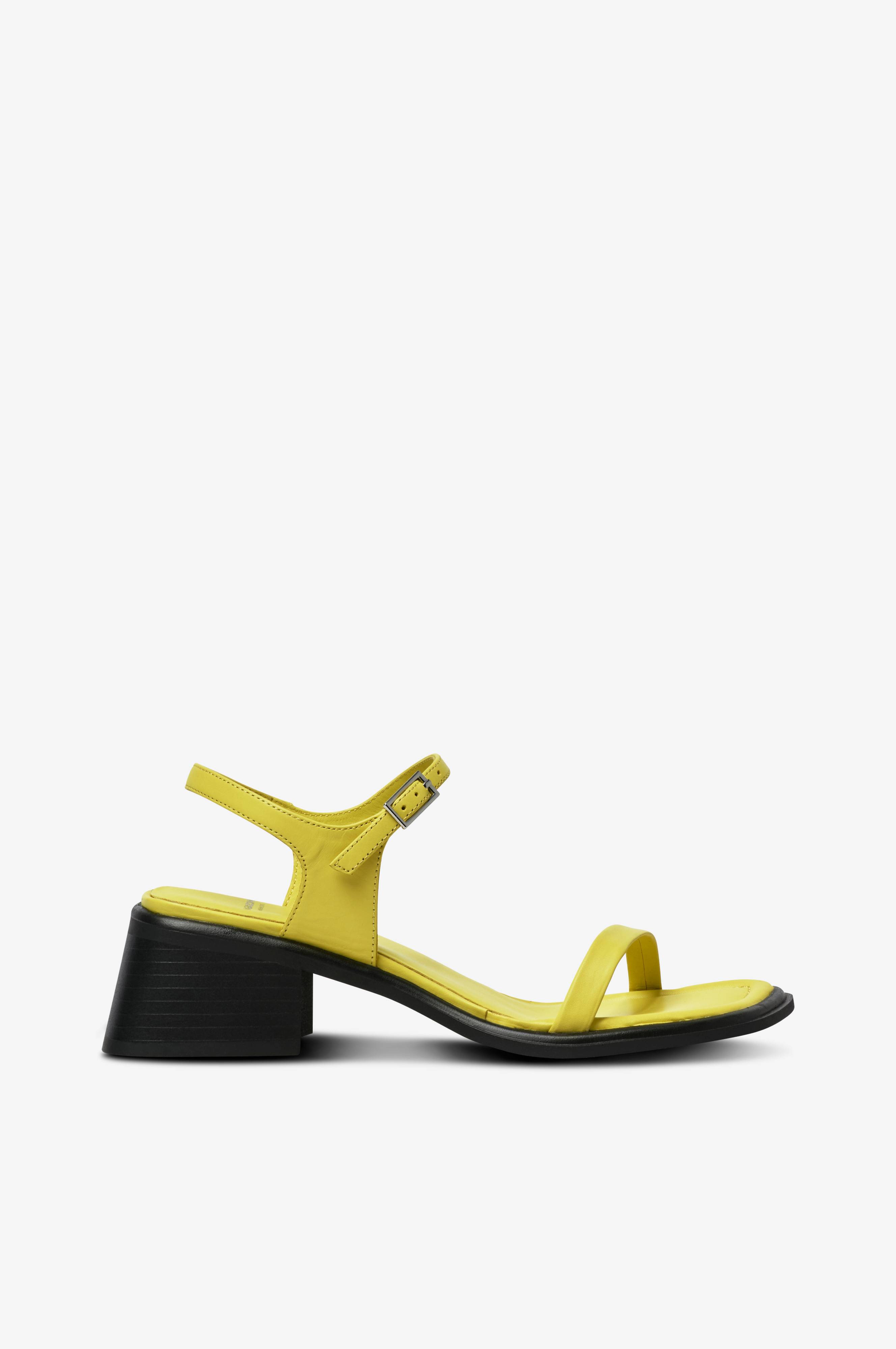 - Sandaler i skind- Firkantet tåform- Ankelrem med justerbart metalspænde på siden- Blød fodseng i skind- Ydersål i gummi- Blokhæl- Hælhøjde 5 cm