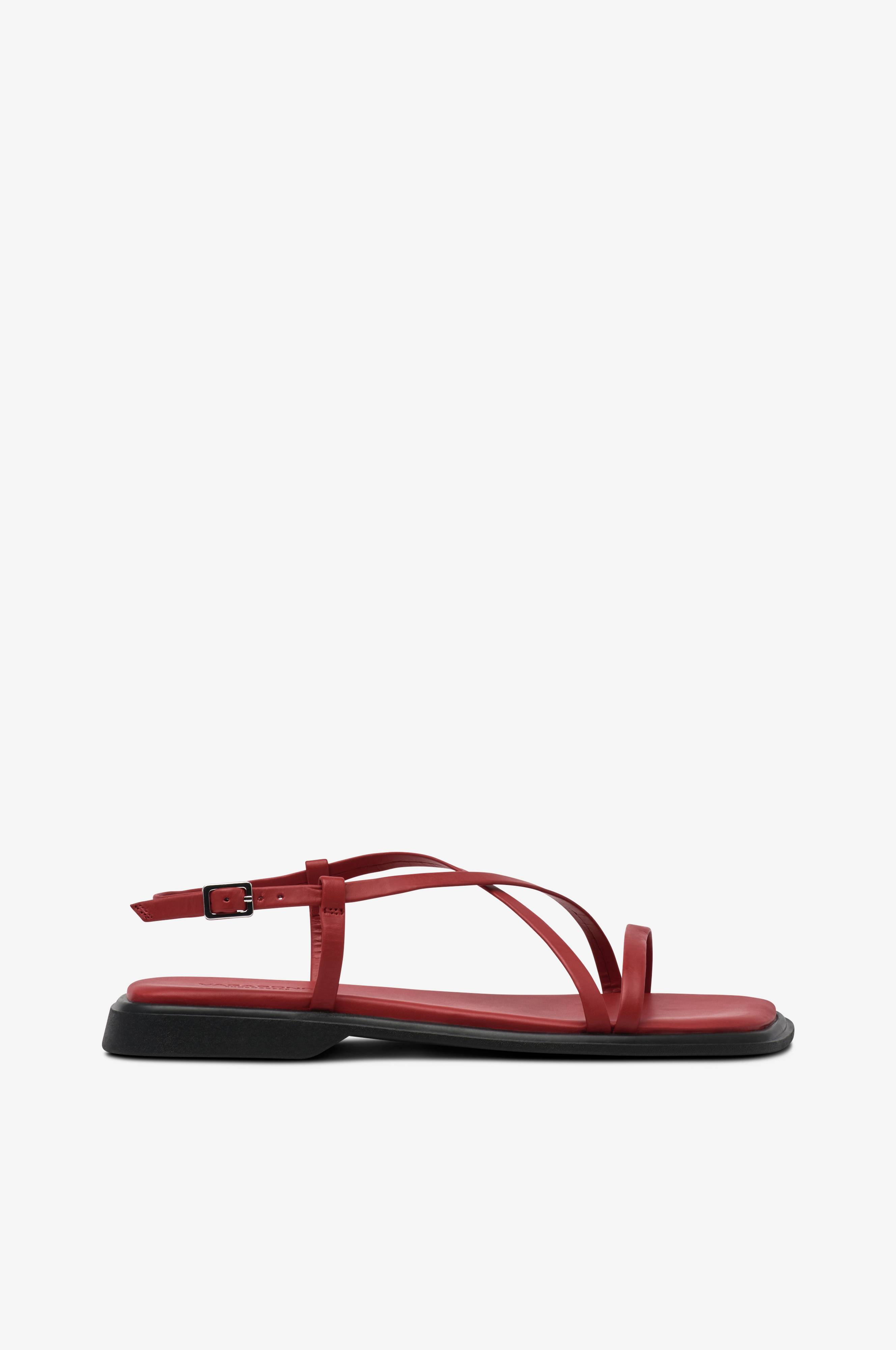 • Stilrene remsandaler• Tynde, røde remme i læder• Sølvfarvet spænde ved anklen