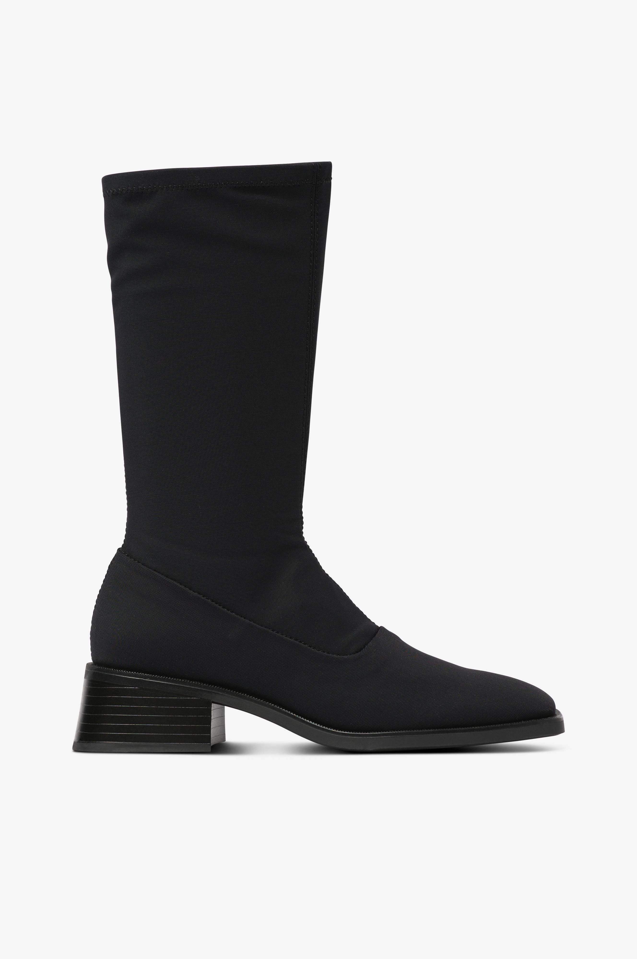 Høj støvle i tekstil med stretch, som sidder til rundt om læggen. Firkantet tå og let A-formet hæl for en moderne silhuet. Skafthøjde ca. 27 cm. Hælhøjde ca. 4,5 cm.