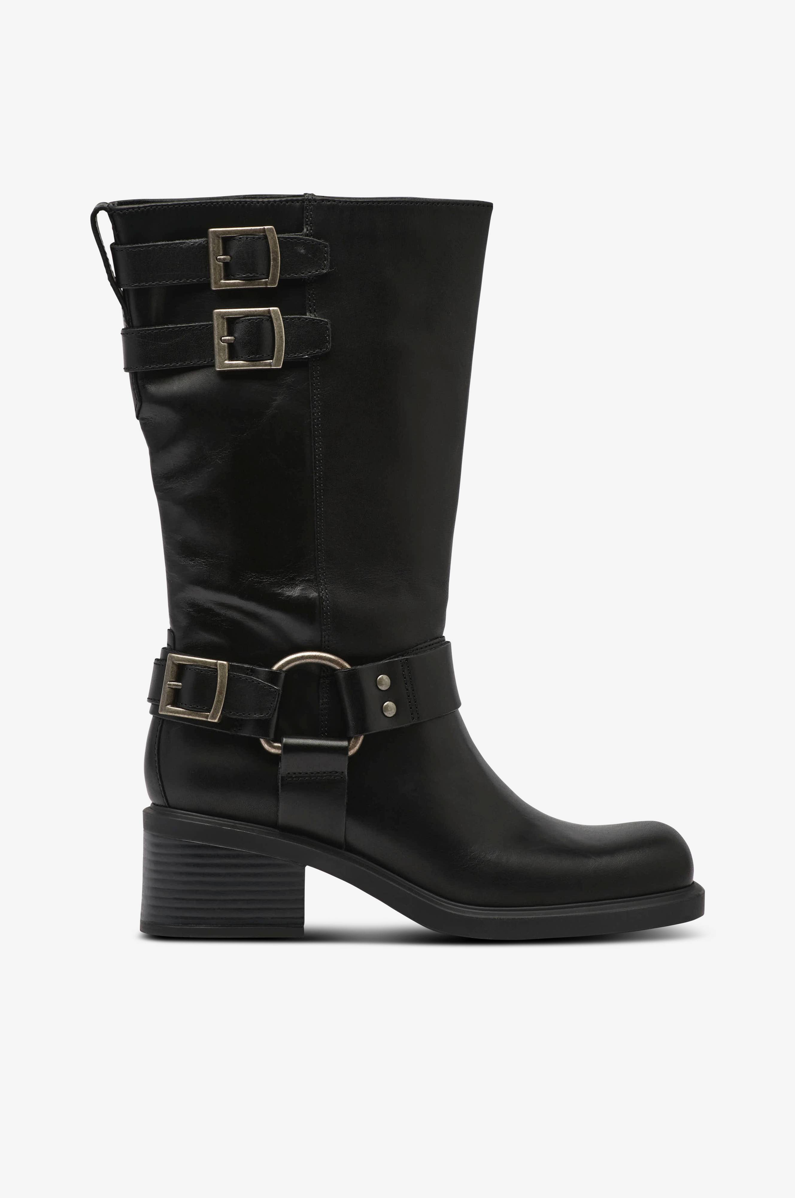 • Mediumhøje støvler i læder med dekorative spænder på skaftet• Blokhæl• Firkantet tåform• Tekstilforing• Indersål i læder• Ydersål i gummi• Hælhøjde: 5 cm• Skafthøjde: 27 cm i str. 37