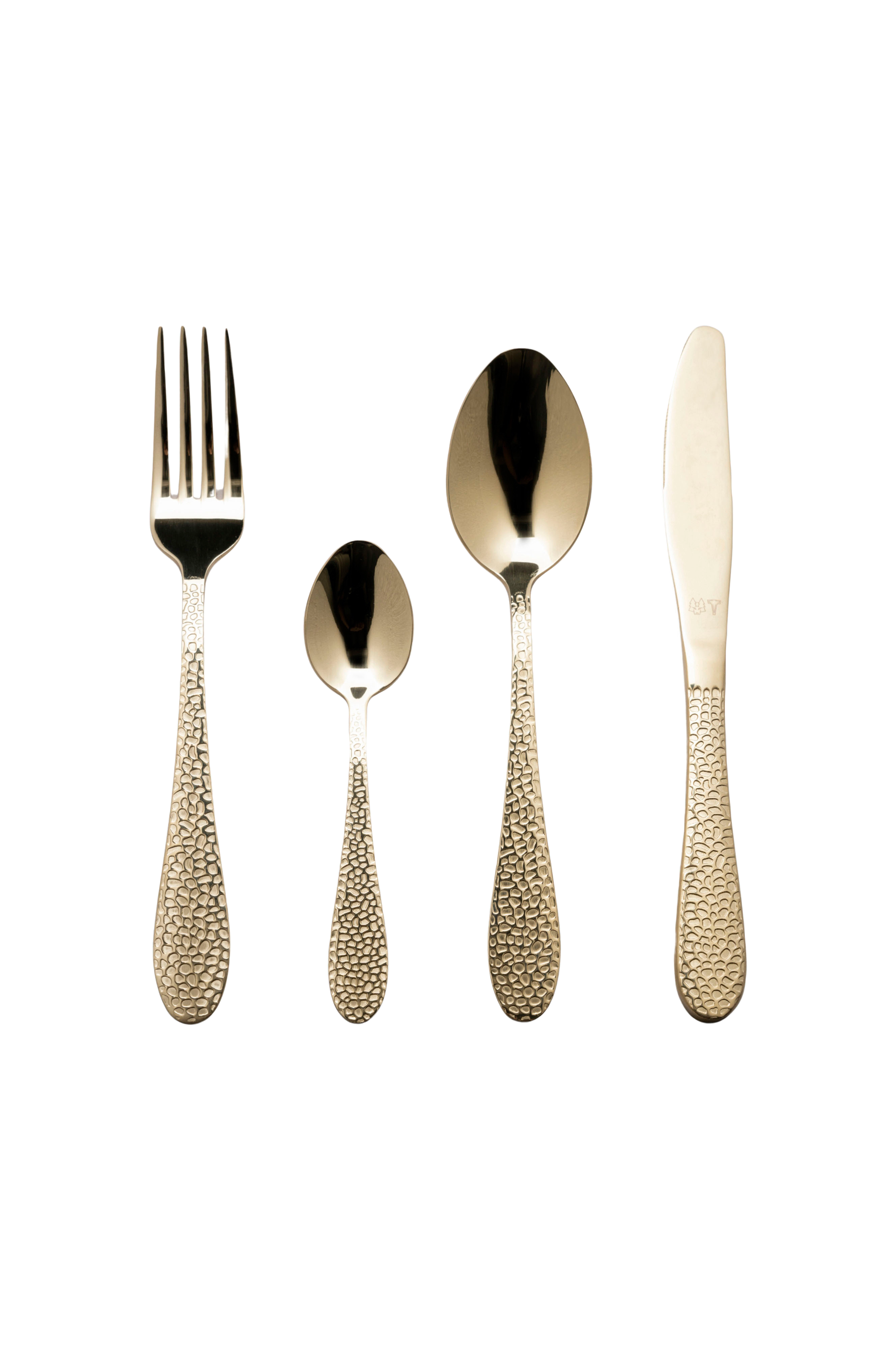 4 gafler, 4 knive, 4 skeer og 4 teskeer, alt sammen pænt pakket i en elegant æske.