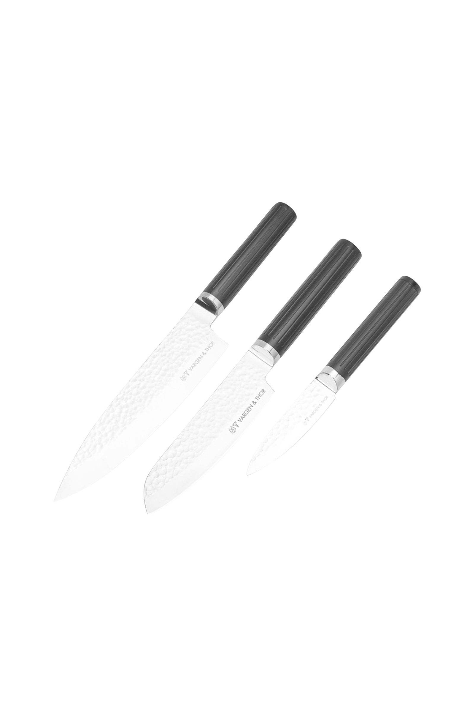 Knivskarpt blad, fremstillet af svensk stål.Tre velafbalancerede og matchende knive i et komplet sæt. Med vargen & thors nye halo-håndtag og hamret mønster - leveret i en stilfuld gaveæske.