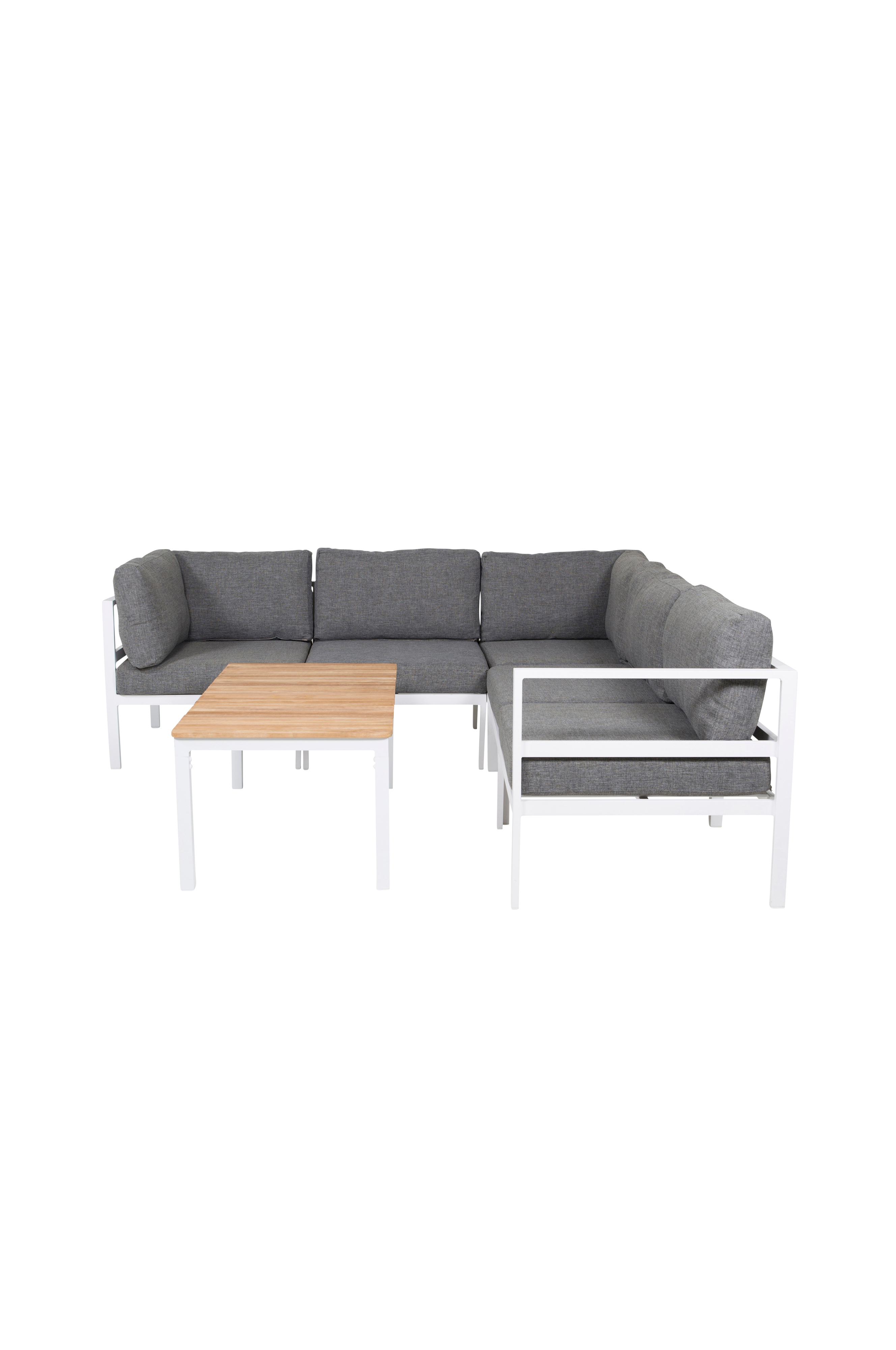Cassie modulsofa med 3 Cassie hjørnedele i aluminium med hynder i polyester. Hjørnedelens mål: Totalhøjde: 65,5 cm, Bredde: 74 cm, Dybde: 74 cm, Højde: 30 cm. Sammen med 2 Cassie midterdele i aluminium og siddehynder i polyester. Midterdelens mål: Totalhøjde: 65,5 cm, Bredde: 74 cm, Dybde: 74 cm, Højde: 30 cm. Inkluderet i sofagruppen er et Brina sofabord med bordplade i teak og bordben i aluminium. Bordets mål: Længde: 110 cm, Bredde: 60 cm, Højde: 45 cm. Sofagruppen kræver let montering.