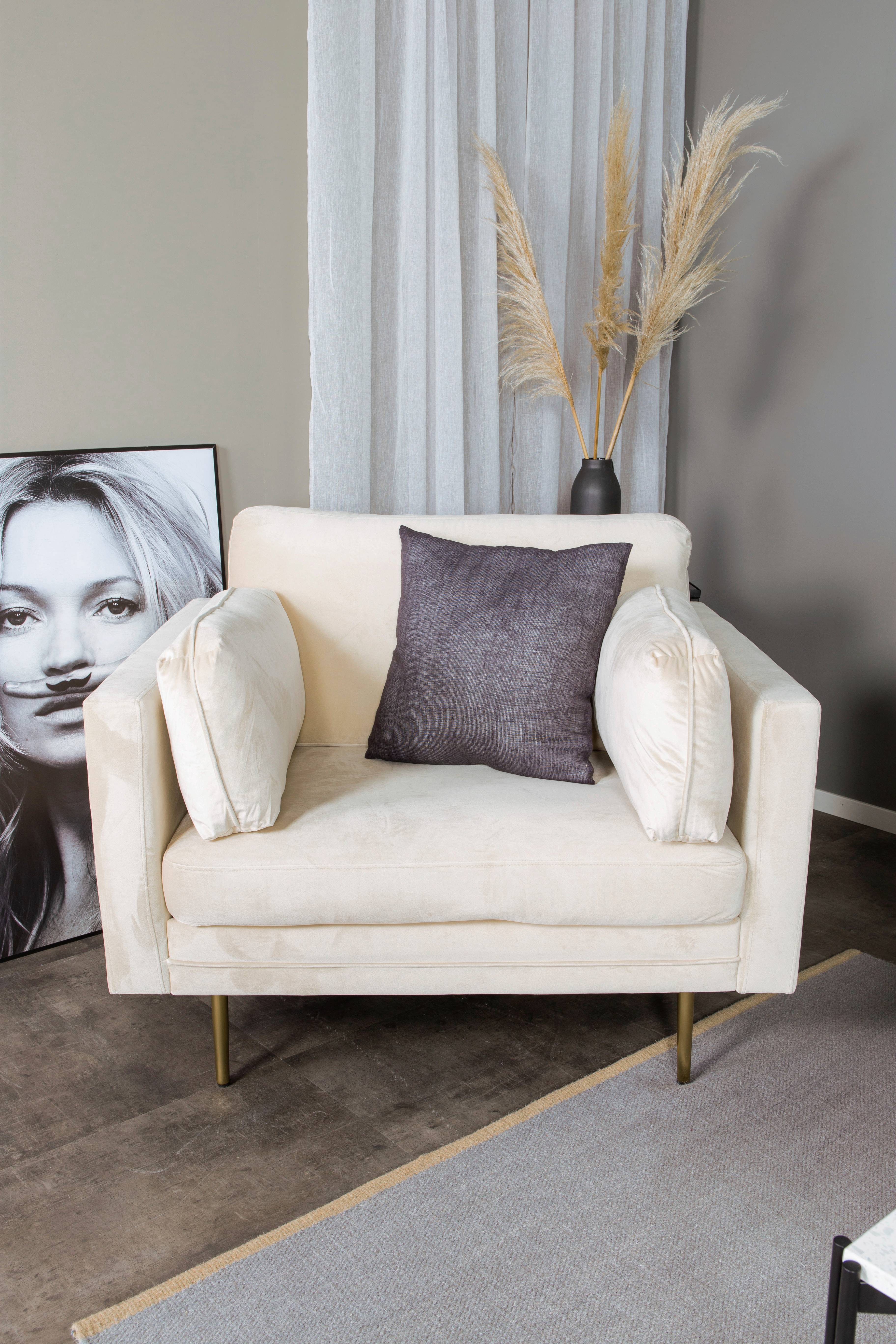 Behagelig lænestol i velour med messingfarvede metalben. Træstel og sæde med nozagfjedre og polyeter. Martindale > 10.000. Siddebredde 88 cm. Højde til armlæn 70 cm. Benenes højde 20,5 cm. Tykkelse på siddehynder 15 cm og ryghynder 20,5 cm. Monter kun benene.