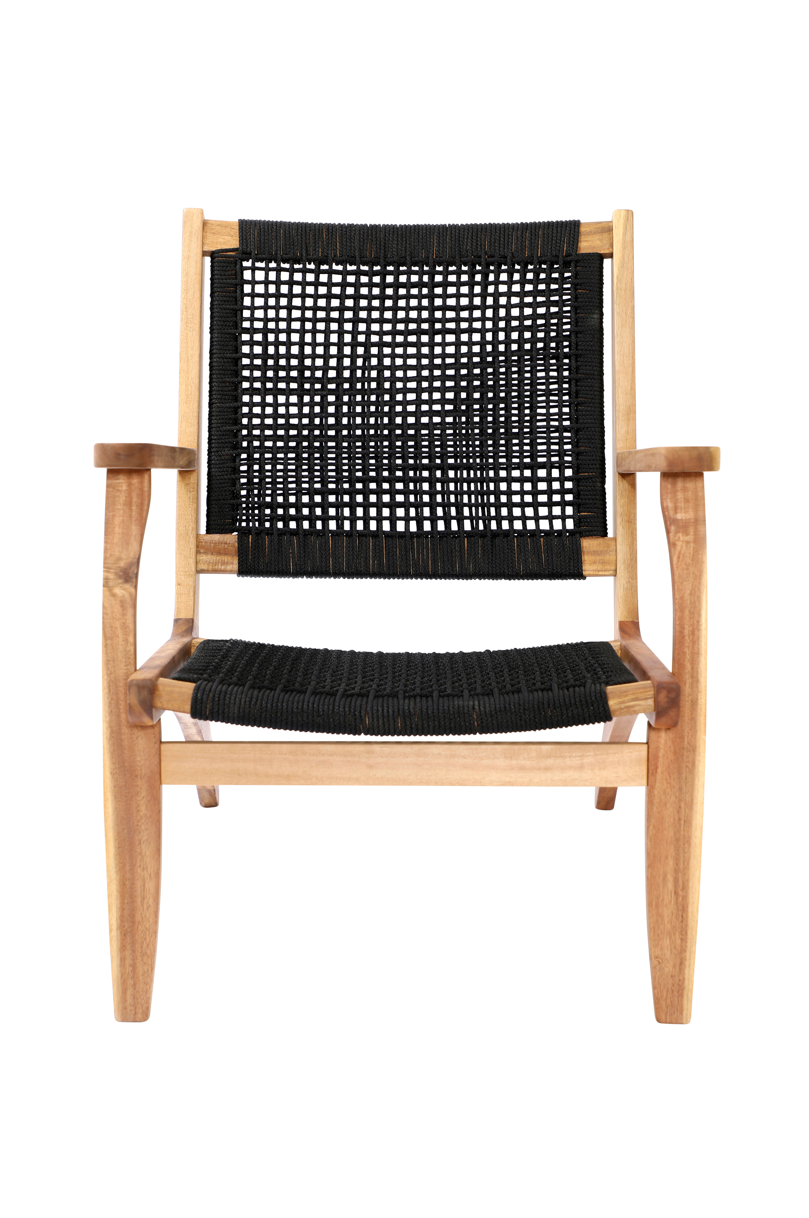 Livå lænestol med hynde i flettet sort reb og stel i akacietræ. Mål: Længde: 62 cm, Dybde: 75 cm, Højde: 79 cm og siddehøjde: 40 cm. Kræver let montering.