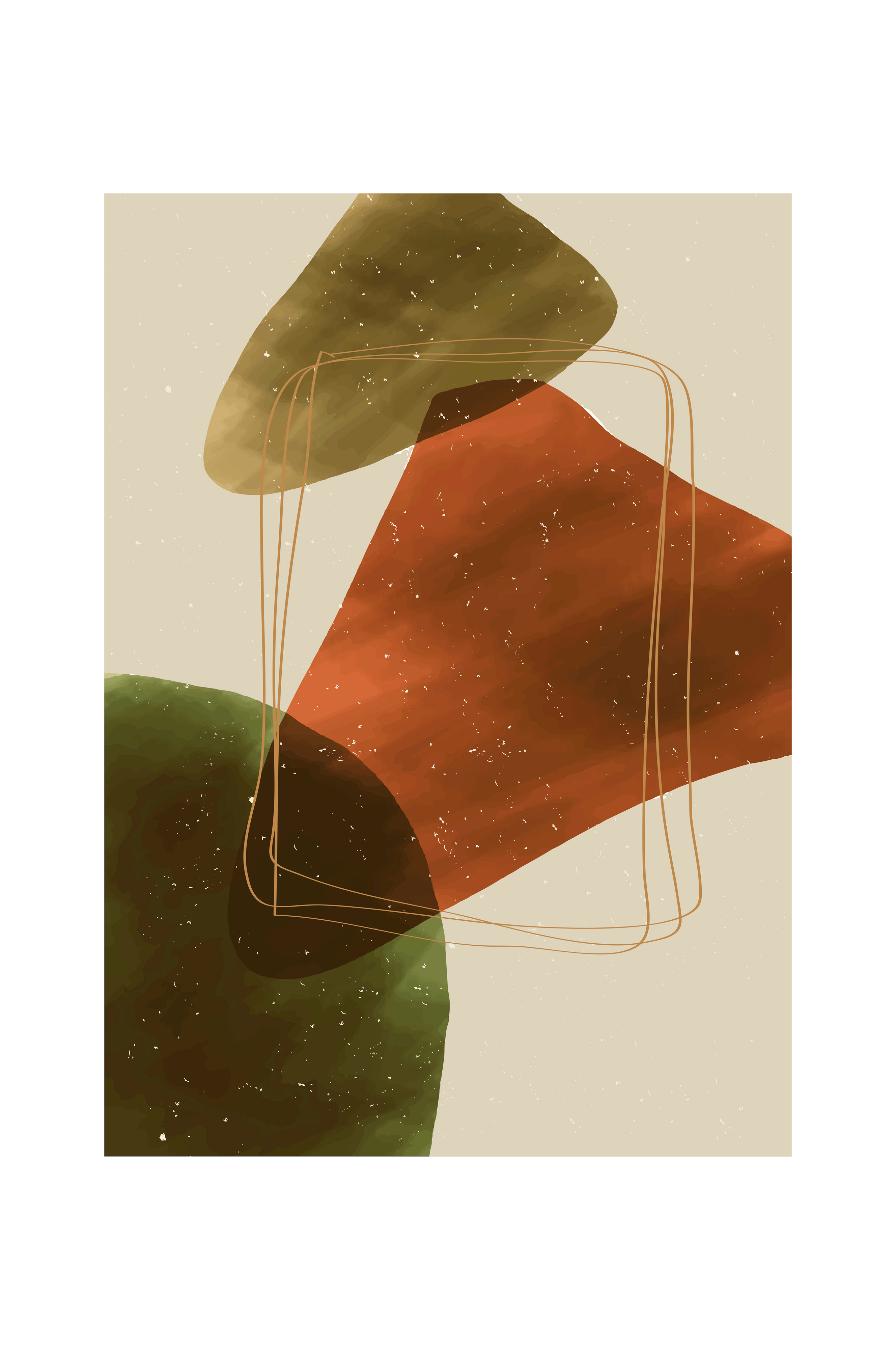 En abstrakt plakat med bløde former og linjer som garanteret vil drage blikket. Plakaten "Canyon" er i toner af grønt og rødt med gyldne indslag på en beige baggrund og har en smal hvid fotoramme. Giv dine vægge en ny dimension!