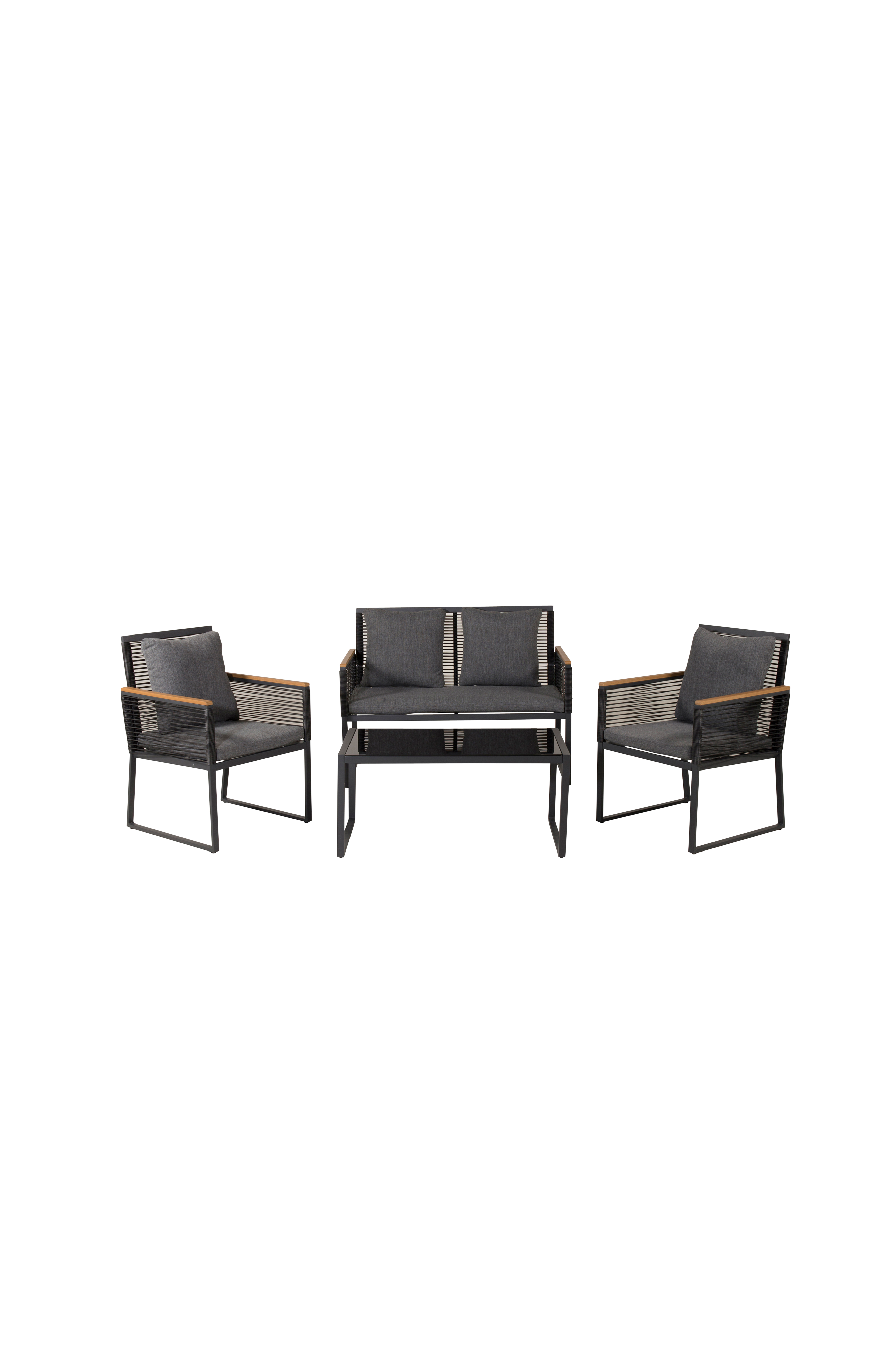 Velkommen hjem til en afslappende og iøjnefaldende sofagruppe i trendy design! Dallas sofagruppe er en skøn og flot gruppe i aluminium med tilhørende bord, med en bordplade i glas. Slidstærke hynder medfølger. Gruppen har plads til 4 siddende gæster.