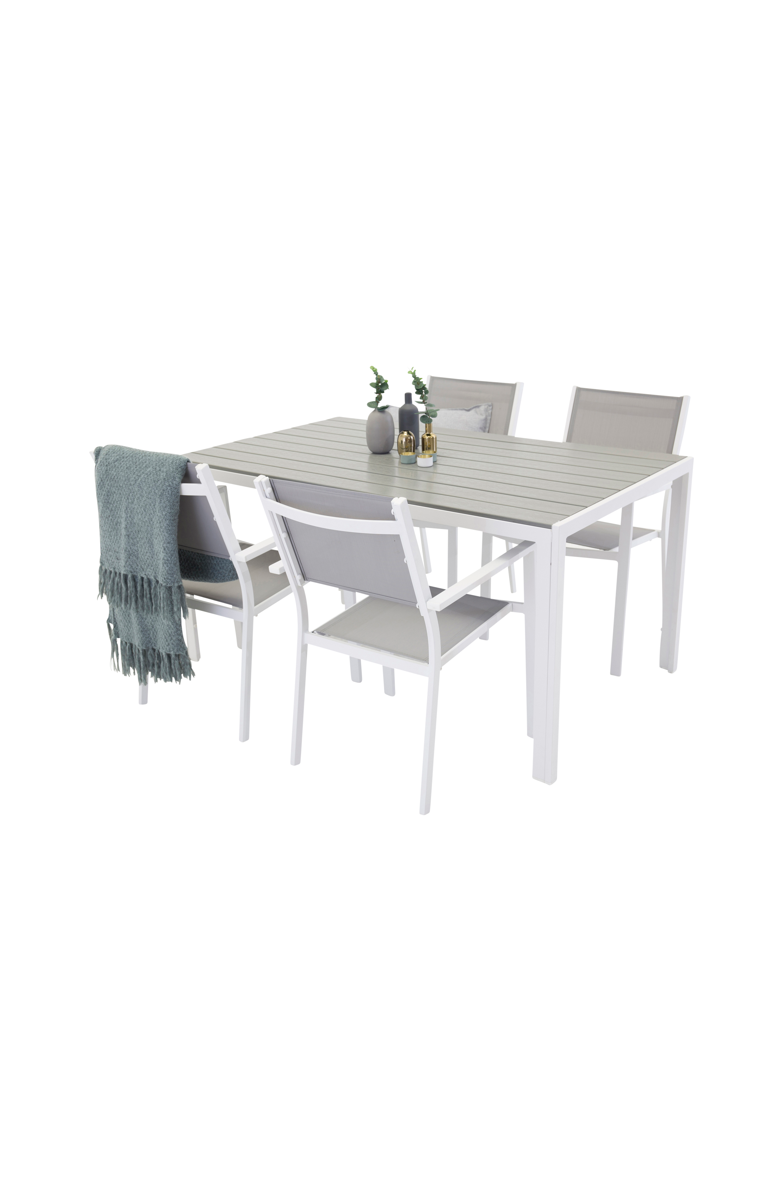 Bliss spisebord i aintwood og hvide bordben i aluminium. Bordets mål: Længde: 150 cm, Bredde: 90 cm, Højde: 74 cm. Matches med 4 stk. stabelbare Cassie spisebordsstole. Stolenes mål: Totalhøjde: 88 cm, Bredde: 50 cm, Dybde: 44 cm, Siddehøjde: 43 cm. Bord og stole kræver let montering.