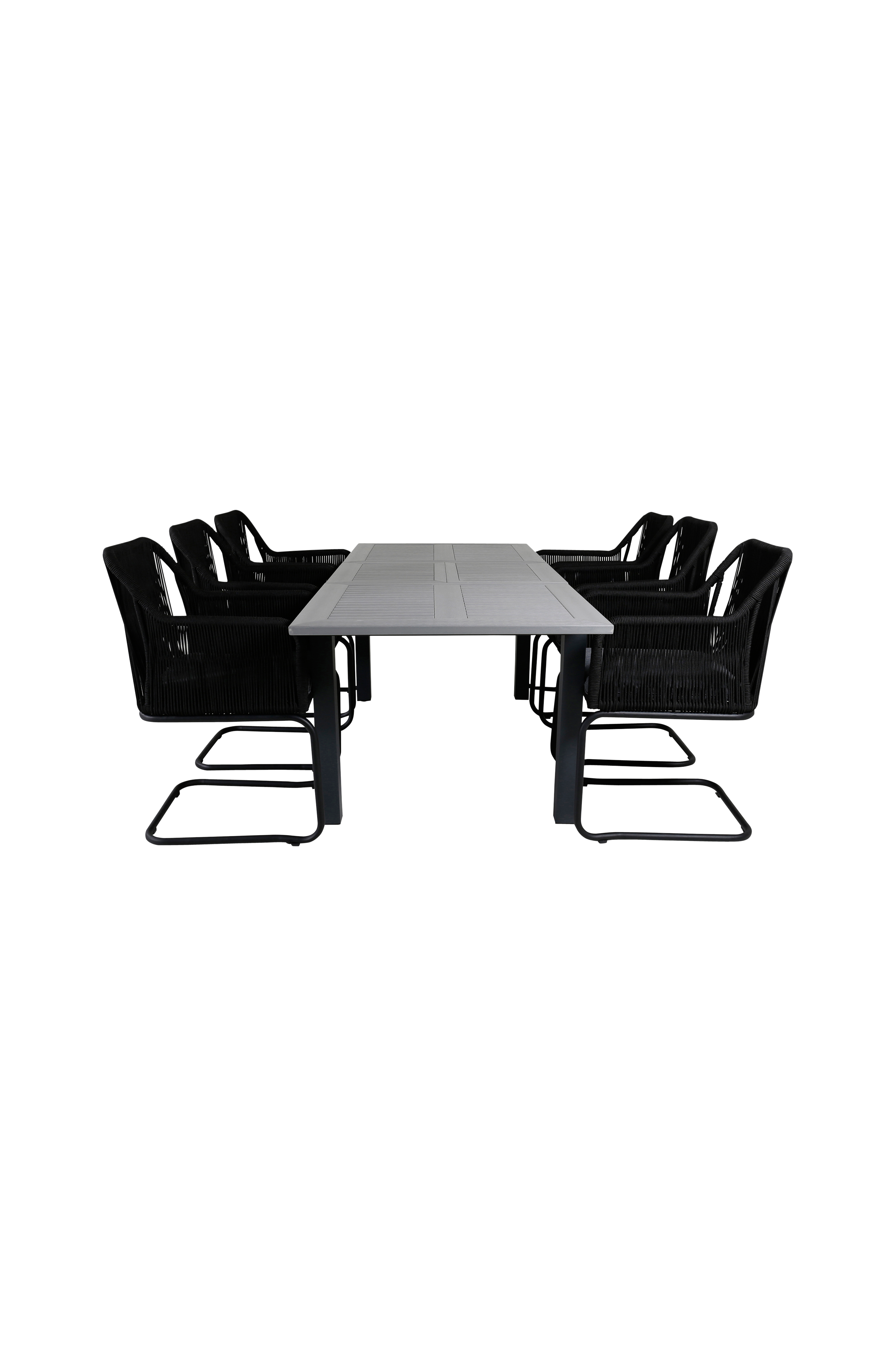 Alf spisebord med en bordplade i aintwood og bordben i aluminium. Bordets mål: Højde: 74 cm, Bredde: 90 cm, Længde: 152 cm. Matches med 6 Levis stole. Stolen er fremstillet i reb og polyester med stoleben i stål. Stolenes mål: Totalhøjde: 96 cm, Bredde: 55 cm, Dybde: 67 cm. Siddehøjde: 49 cm. Siddebredde: 45 cm. Siddedybde: 55 cm. Bord og stole kræver let montering.