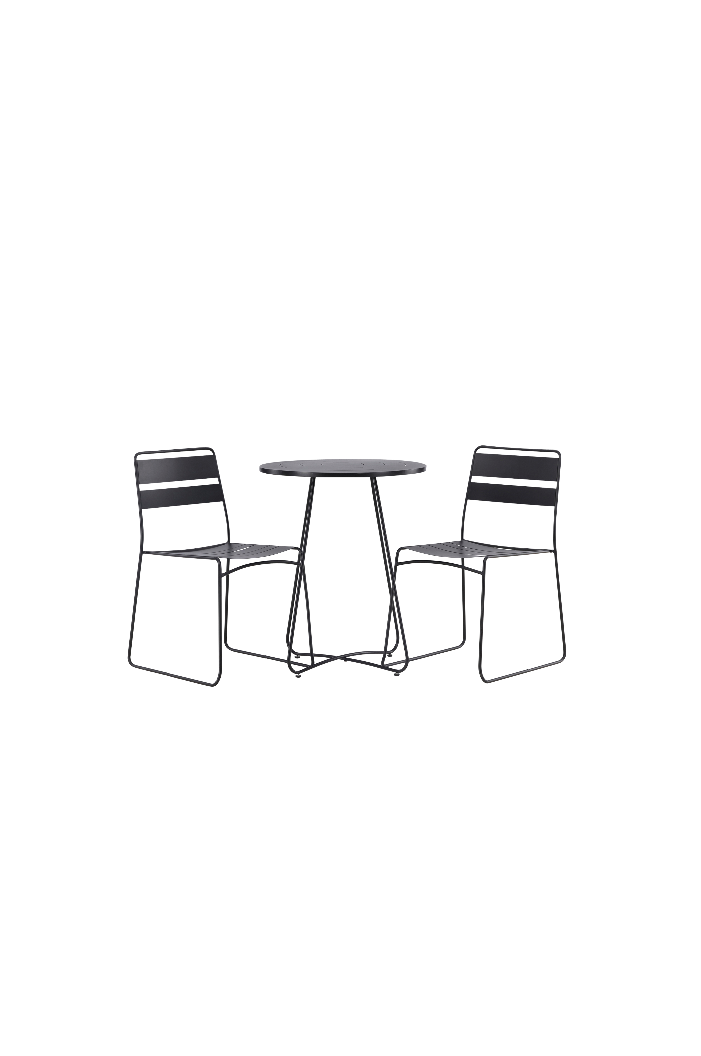 Skab et stilfuldt og minimalistisk blikfang på din terrasse eller altan! Det smukke cafebord fra Bacong-serien har en rund plade og smalle stålben. Her sammen med vores smagfulde spisebordsstole fra serien Lina. Denne charmerende stol er lavet af slidstærkt stål i sodet farve og matcher bordet perfekt. Det skal føles godt at sætte sig ned her til en afslappende stund!