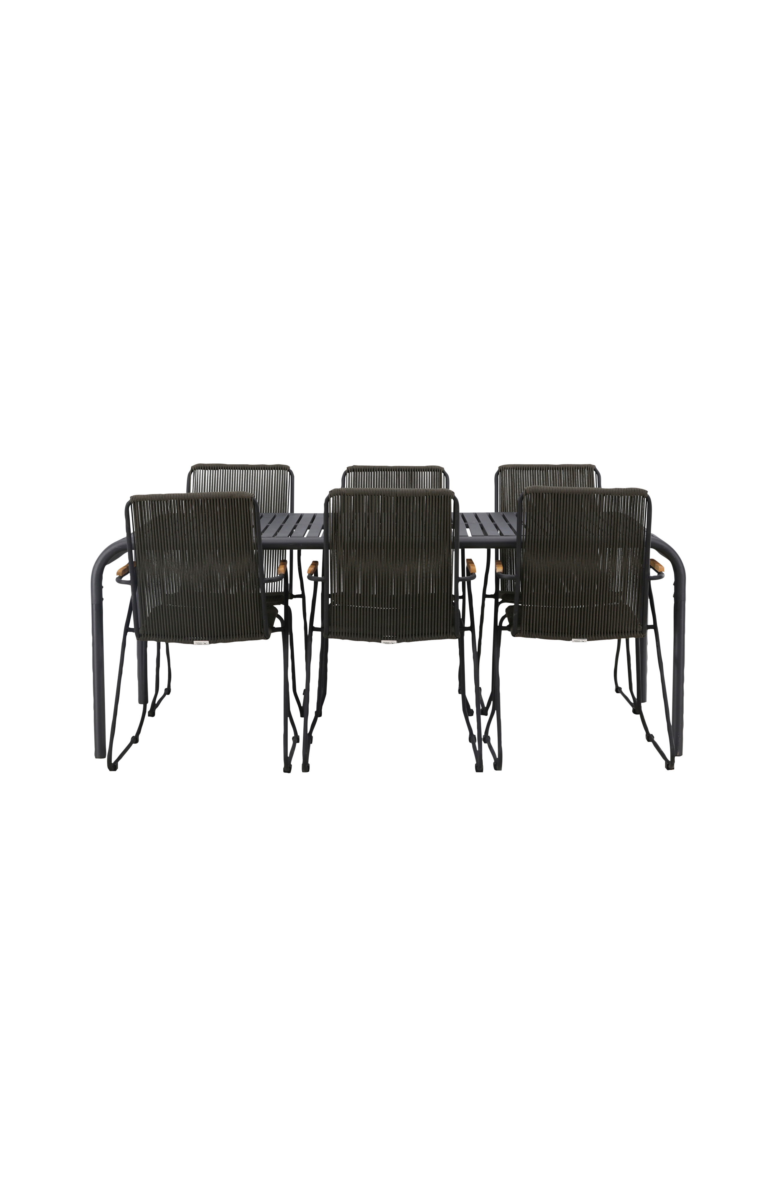 En charmerende spisegruppe som stikker ud fra mængden! Det rektangulære spisebord Borneo har smidige former med en rillet bordplade, som bøjer ned langs kanterne ved benene. Gennemgående lavet i det slidstærke materiale aluminium. Her sammen med vores spisebordsstole fra serien Bois. Stolen har et behageligt design med zinkkonstruktion, rebsæde og dekorative teakarmlæn. Skab et blikfang, der imponerer på din altan!