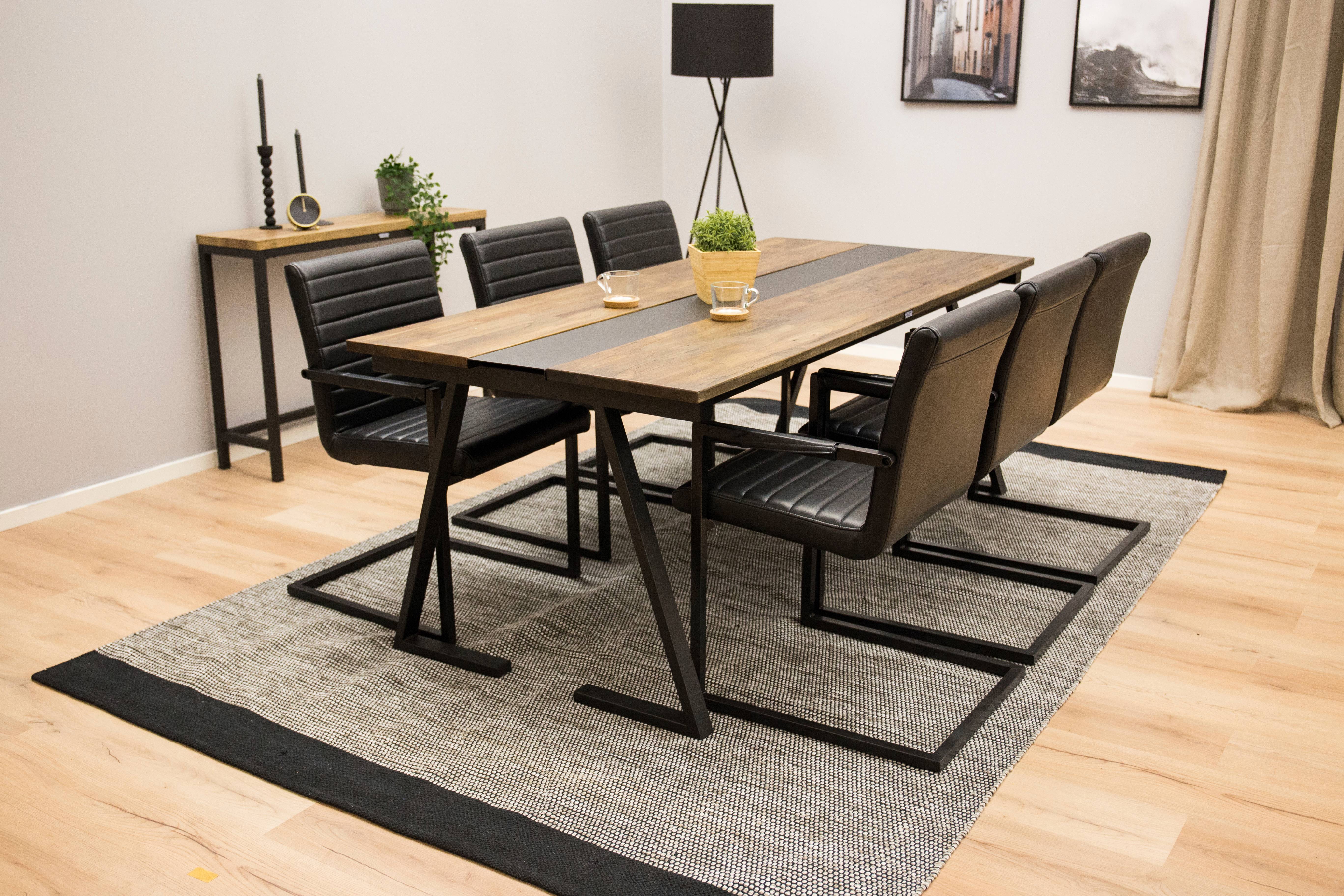 Rustik spisegruppe med flotte detaljer inkl. 6 stole i sort PU. Bordet består af en massiv olieret teakbordplade og en metalskinne i sort i midten. Mål bord: Længde: 200 cm Bredde: 100 cm Højde: 75 cm Stol: Højde: 88 cm Bredde: 49 cm Dybde: 62 cm