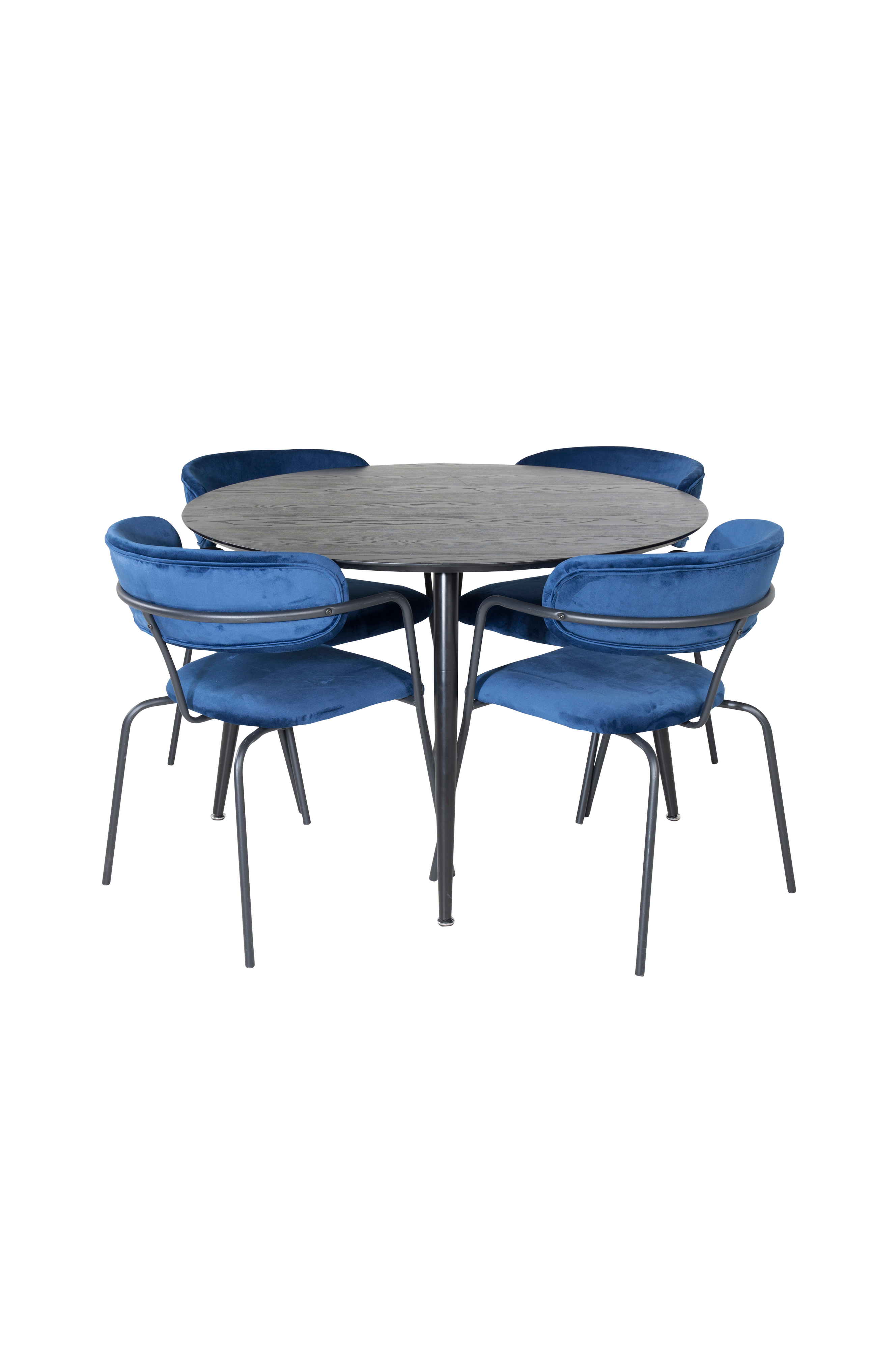 Doris spisebord med en top i MDF og bordben i metal. Matches med 4 Atticus spisebordsstole med sæde i velour og stoleben i metal. Bord og stole kræver let montering. Bordets mål: Diameter: 115 cm, Højde: 75 cm. Stolenes mål: Siddedybde: 43,5 cm, Siddebredde: 47 cm, Siddehøjde: 47 cm.
