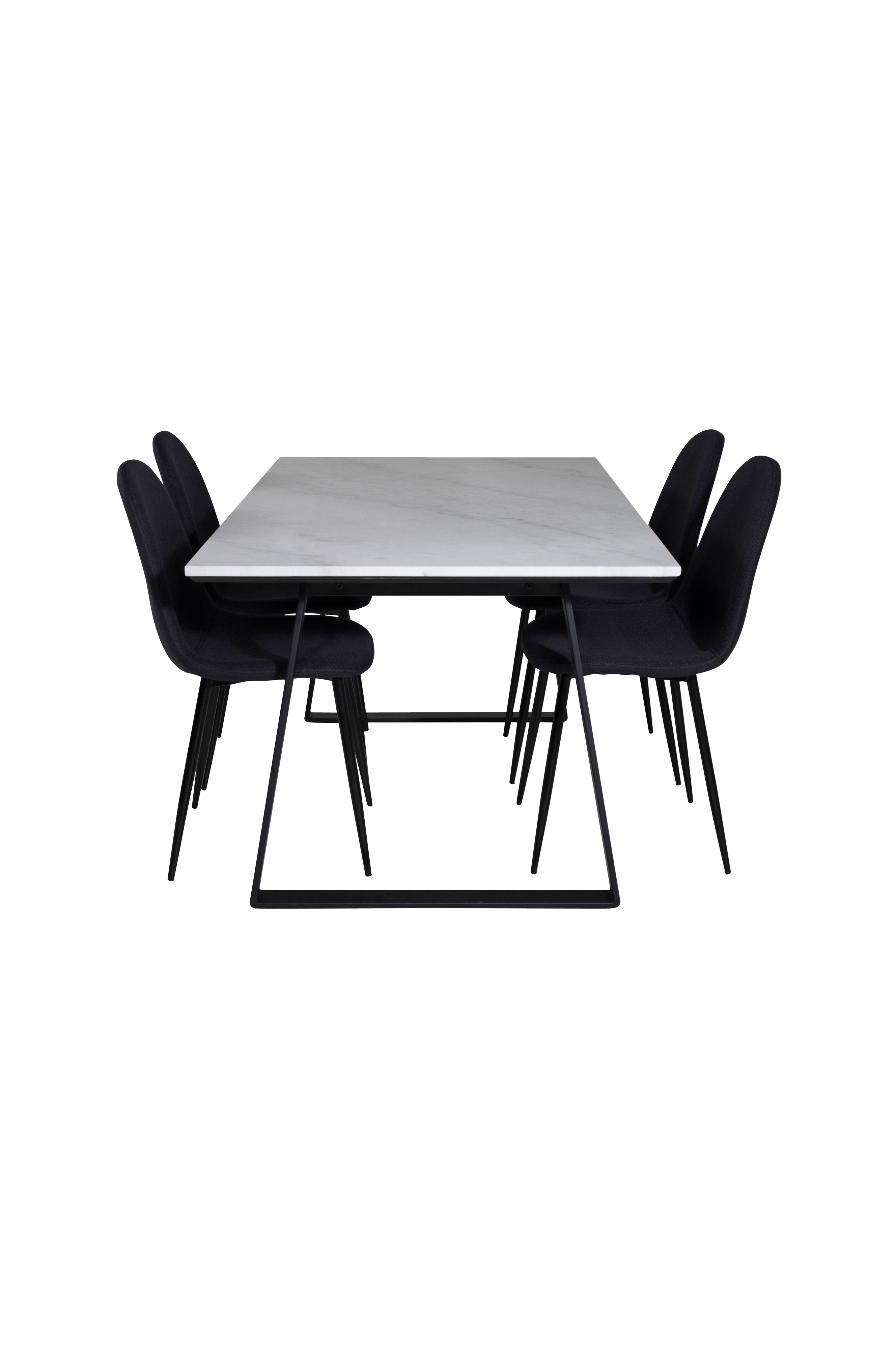Estelle spisebord med bordplade i marmor og bordben i metal. Matches med 4 Polar spisebordsstole med sæde i polyester og stoleben i metal. Bord og stole kræver let montering. Bordets mål: Længde: 140 cm, bredde: 90 cm, højde: 74,5 cm. Stolenes mål: Siddebredde: 41 cm, siddedybde: 39,5 cm, siddehøjde: 45,5 cm.