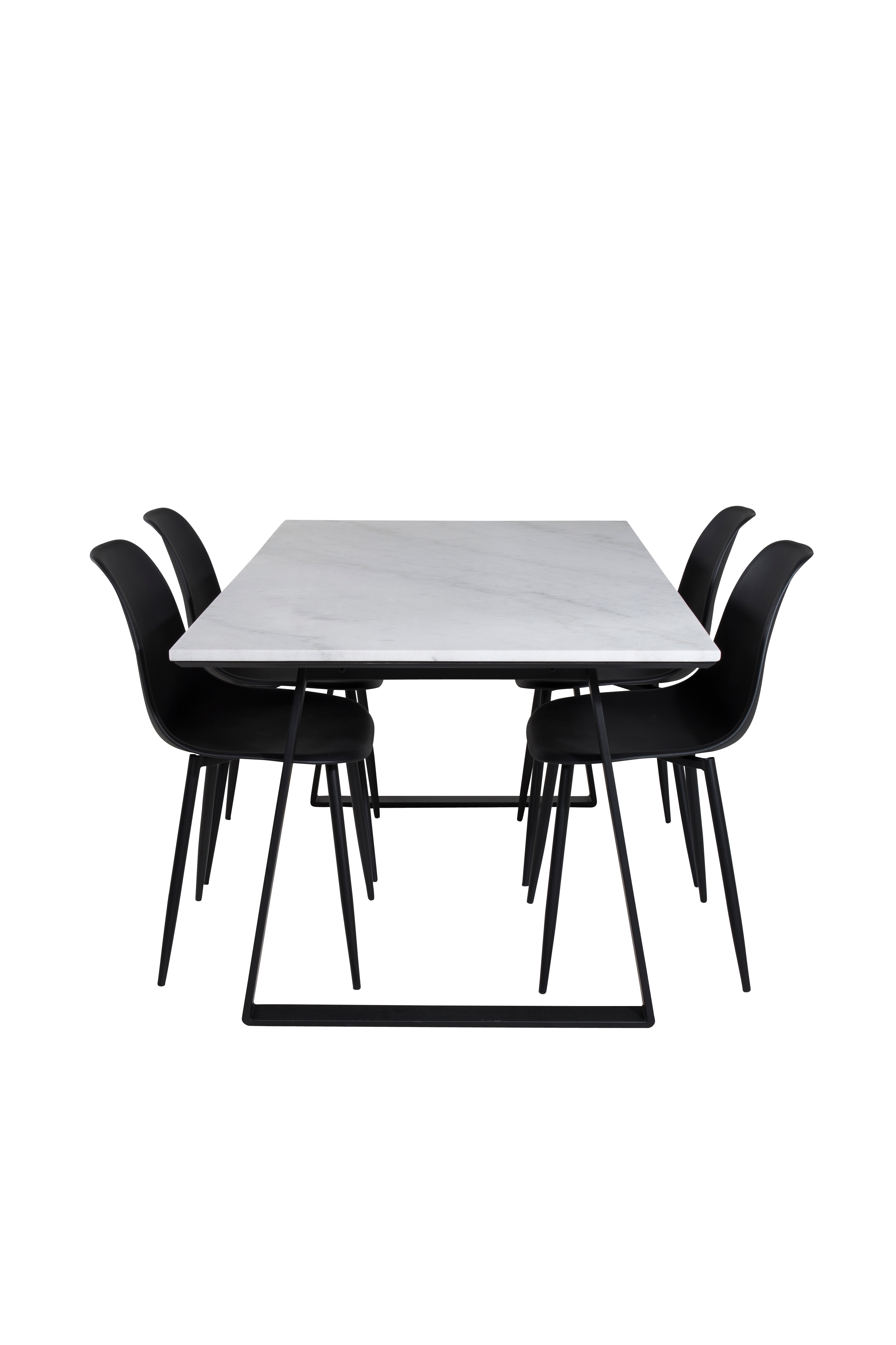Estelle spisebord med bordplade i marmor og bordben i metal. Matches med 4 Polar spisebordsstole med sæde i plast og stoleben i jern. Bord og stole kræver let montering. Bordets mål: Længde: 140 cm, bredde: 90 cm, højde: 74,5 cm. Stolenes mål: Siddebredde: 45 cm, siddedybde: 39 cm, siddehøjde: 46 cm.