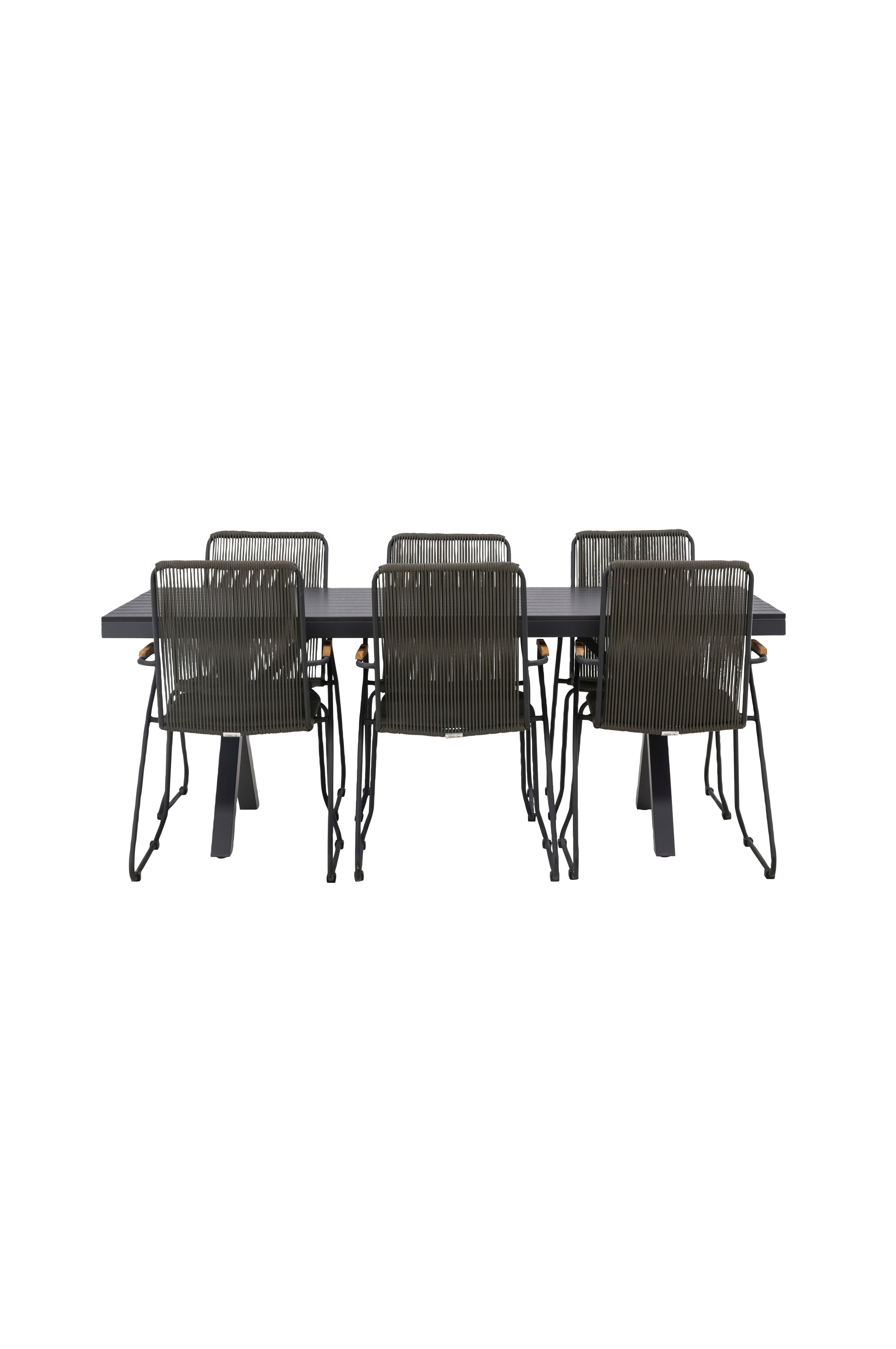 Trendy, holdbar og smart - en spisegruppe der har det hele! Vores rektangulære spisebord Garcia har et klassisk design med en bordplade i aintwood og krydsede aluminiumsben. Her i unik kombination med stole fra serien Bois. Stolen har et behageligt design med armlæn i teak, stålstel og tt-rebsæde. Den gennemtænkte kombination giver dig en personlig spisegruppe, der holder længe!