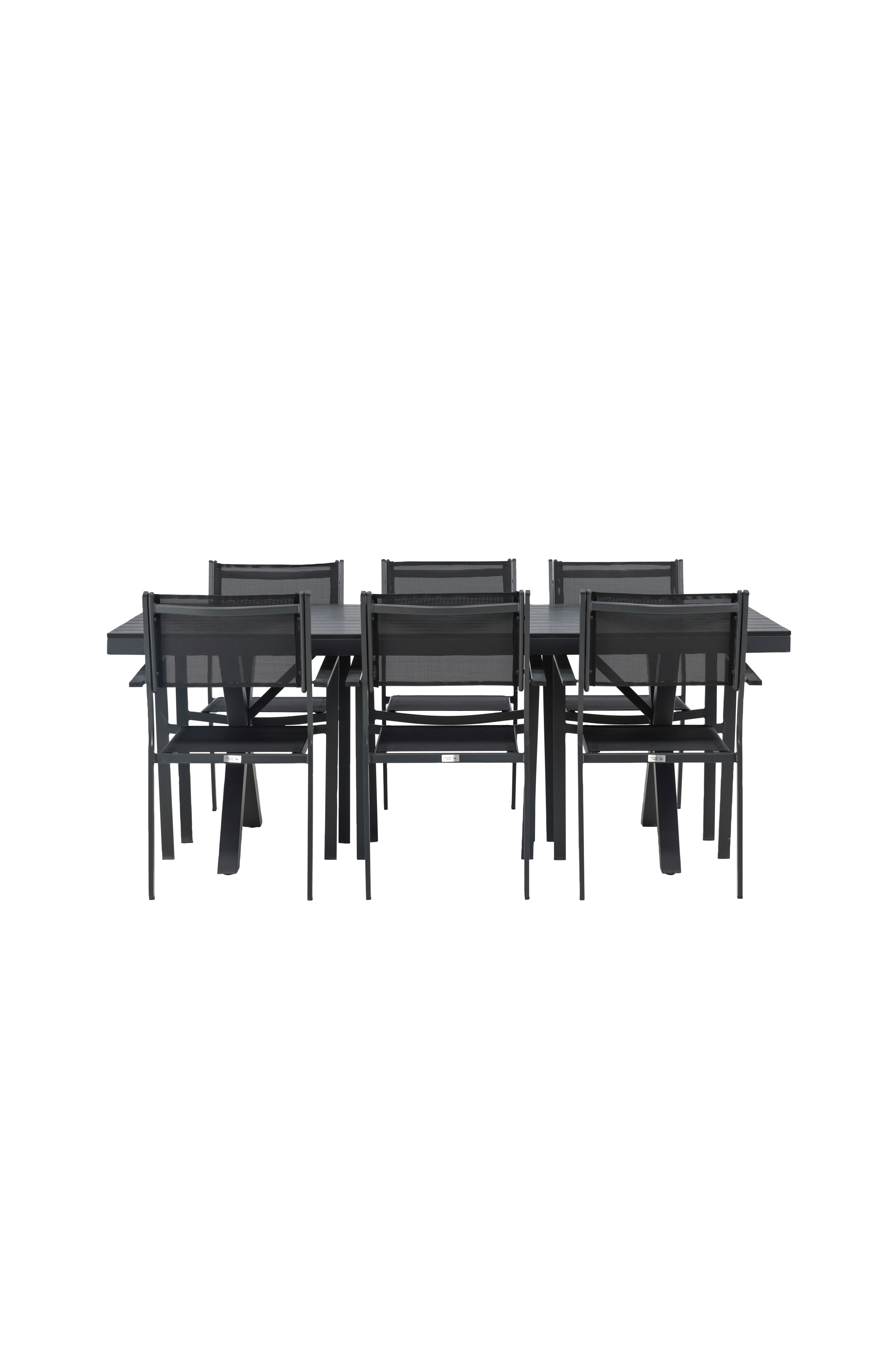 Du kan aldrig gå galt med en hel spisegruppe! Vores rektangulære spisebord Garcia har et klassisk design med en bordplade i aintwood og krydsede aluminiumsben. Her i stilren kombination med vores behagelige stole fra serien Copacabana. Stolen har et lige nordisk design i aluminium og sæde i textilene. Gør dit uderum indbydende og trendy!