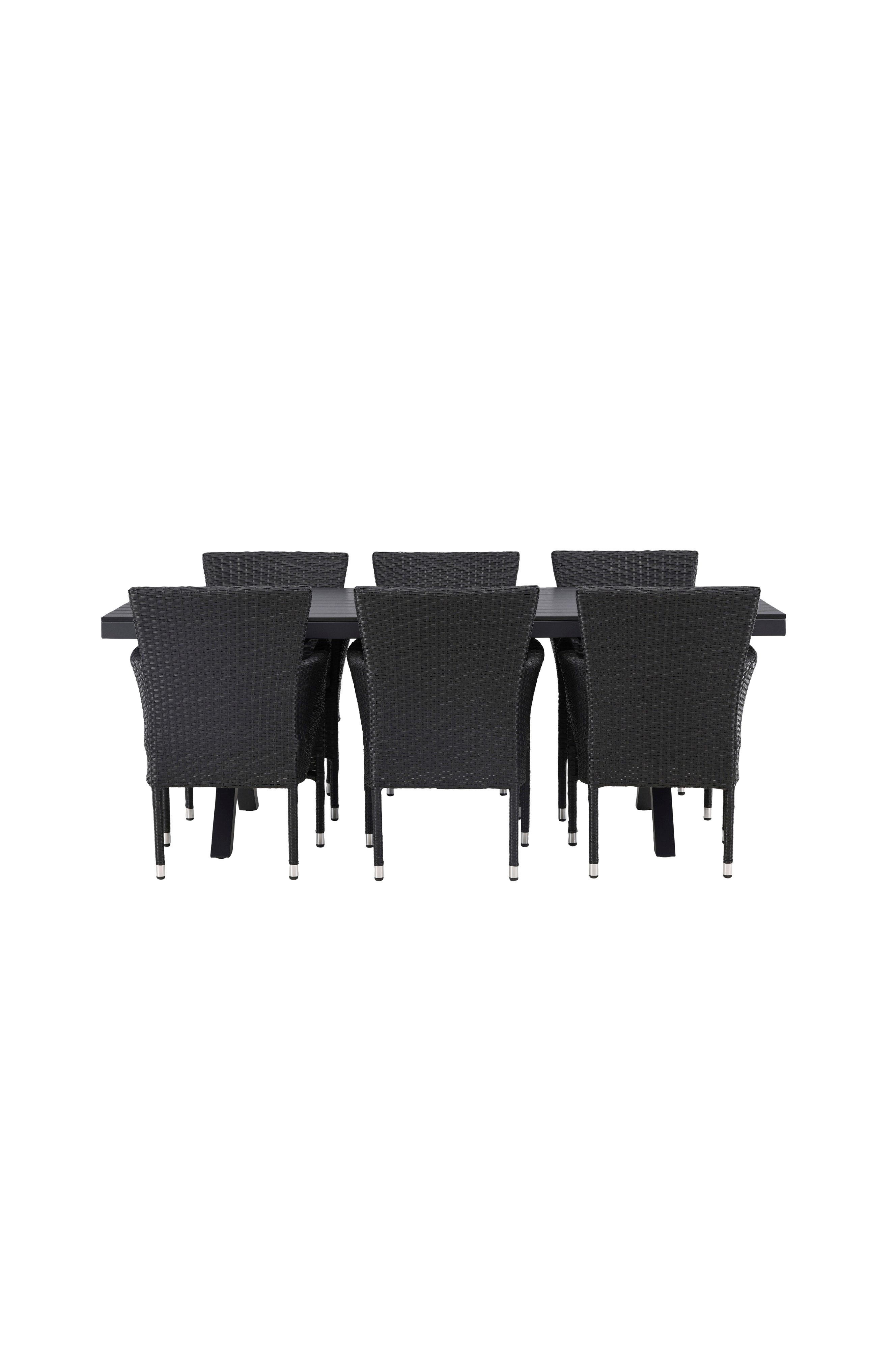 Robust, klassisk og indbydende! Med denne spisegruppe kan du nemt indrette udestuen eller altanen på en moderne og behagelig måde. Vores rektangulære spisebord Garcia har et klassisk design med en bordplade i aintwood og krydsede aluminiumsben. Spisestuestolene indgår i serien Malina og står med garanti tidens tand. Stolen har en stel i pulverlakeret aluminium og er beklædt i kurveflettet kunstrotting. Inviter til mange herlige måltider udendørs fremover!