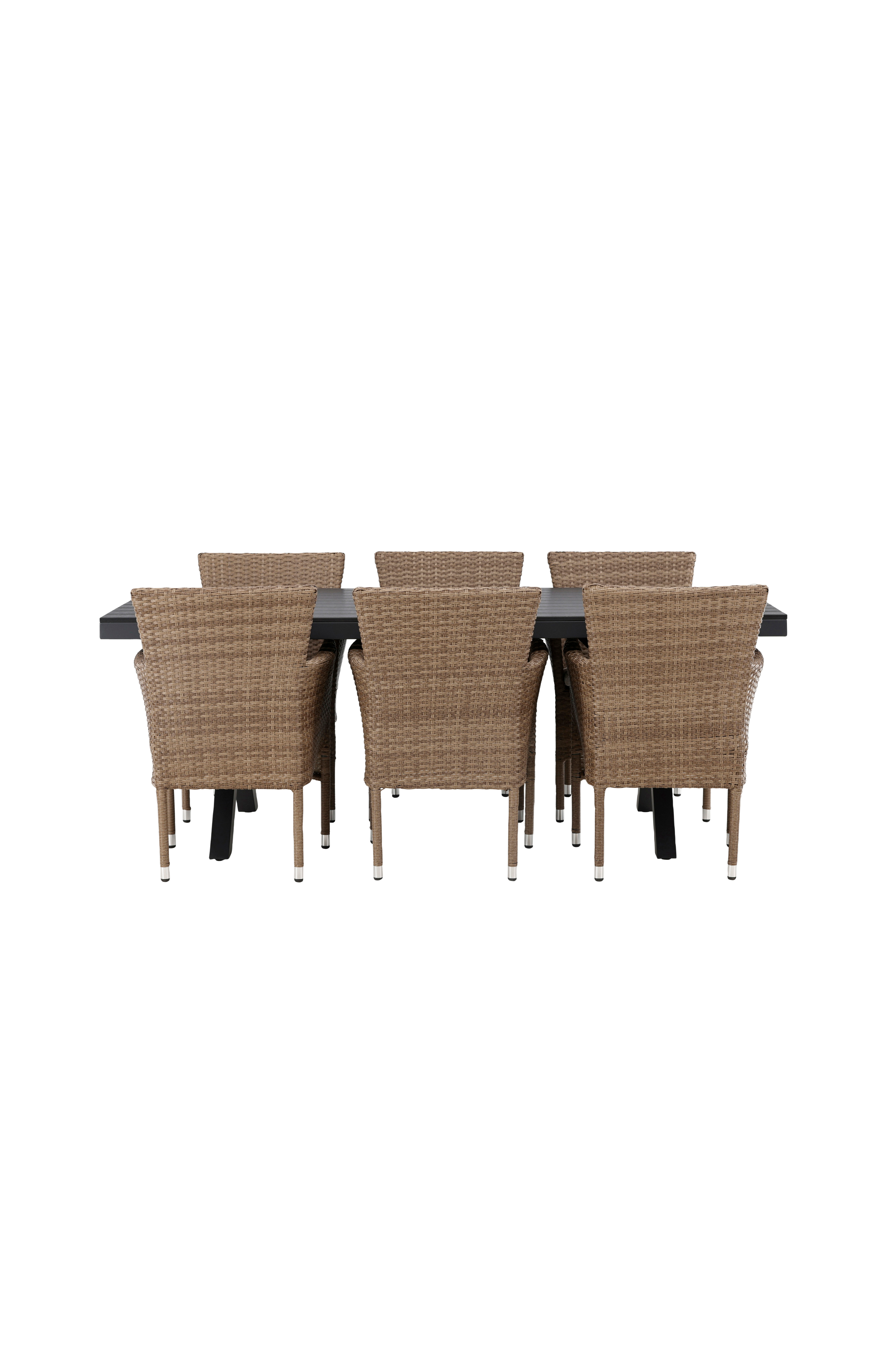 Robust, klassisk og indbydende! Med denne spisegruppe kan du nemt indrette udestuen eller altanen på en moderne og behagelig måde. Vores rektangulære spisebord Garcia har et klassisk design med en bordplade i aintwood og krydsede aluminiumsben. Spisestuestolene indgår i serien Malina og står med garanti tidens tand. Stolen har en stel i pulverlakeret aluminium og er beklædt i kurveflettet kunstrotting. Inviter til mange herlige måltider udendørs fremover!