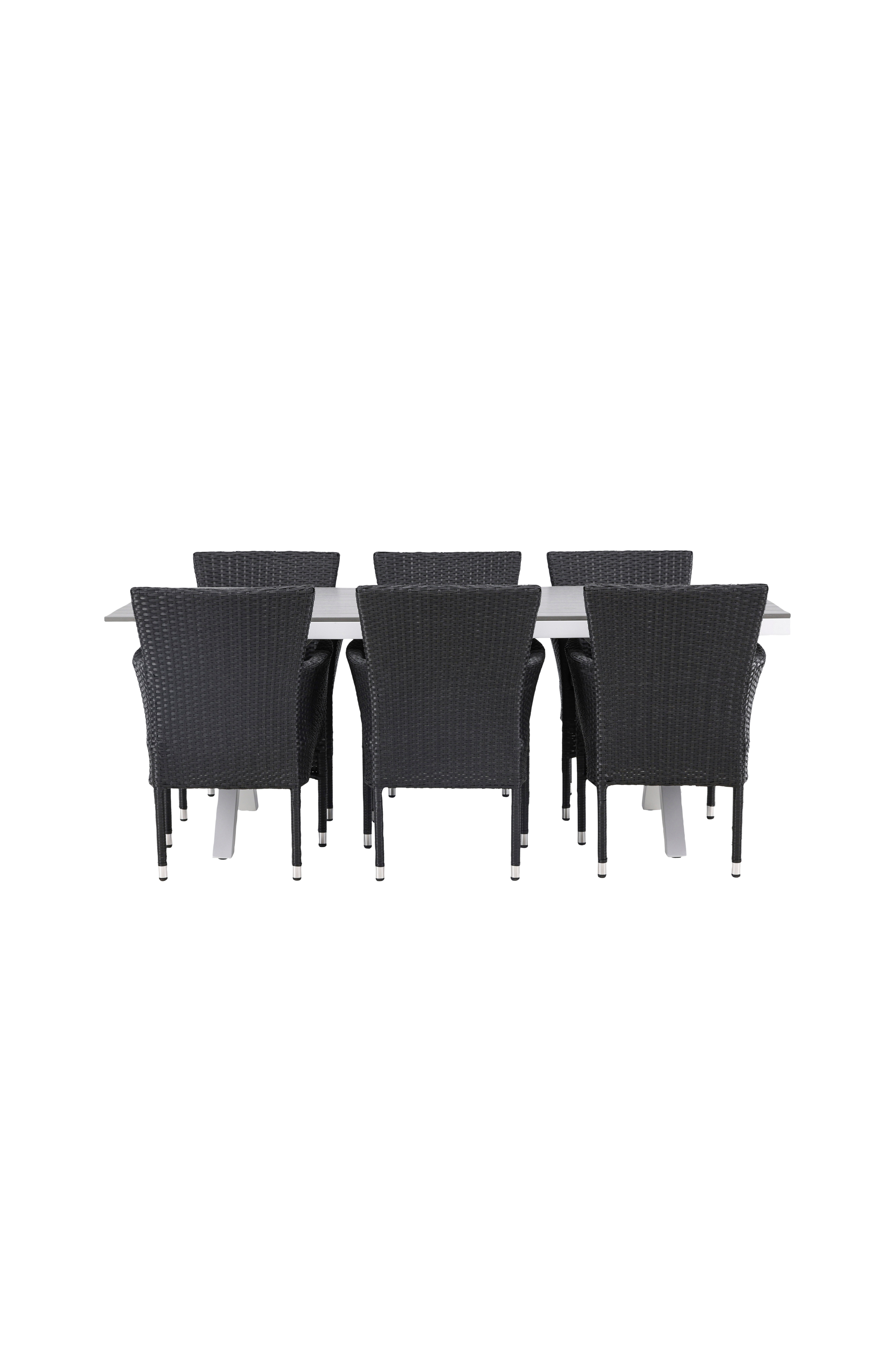 Den perfekte kombination af høj komfort og stilrent design - denne spisegruppe passer til enhver lejlighed! Vores rektangulære spisebord Garcia har et klassisk design med en bordplade i smukt aintwood og krydsede aluminiumsben. Her i en lækker kombination med kunstrotting-stole fra serien Malina. Stolen har et stel i aluminium og sæde i kunstrotting i en sort farve. Sid behageligt til sommer og nyd dejlige måltider udenfor!
