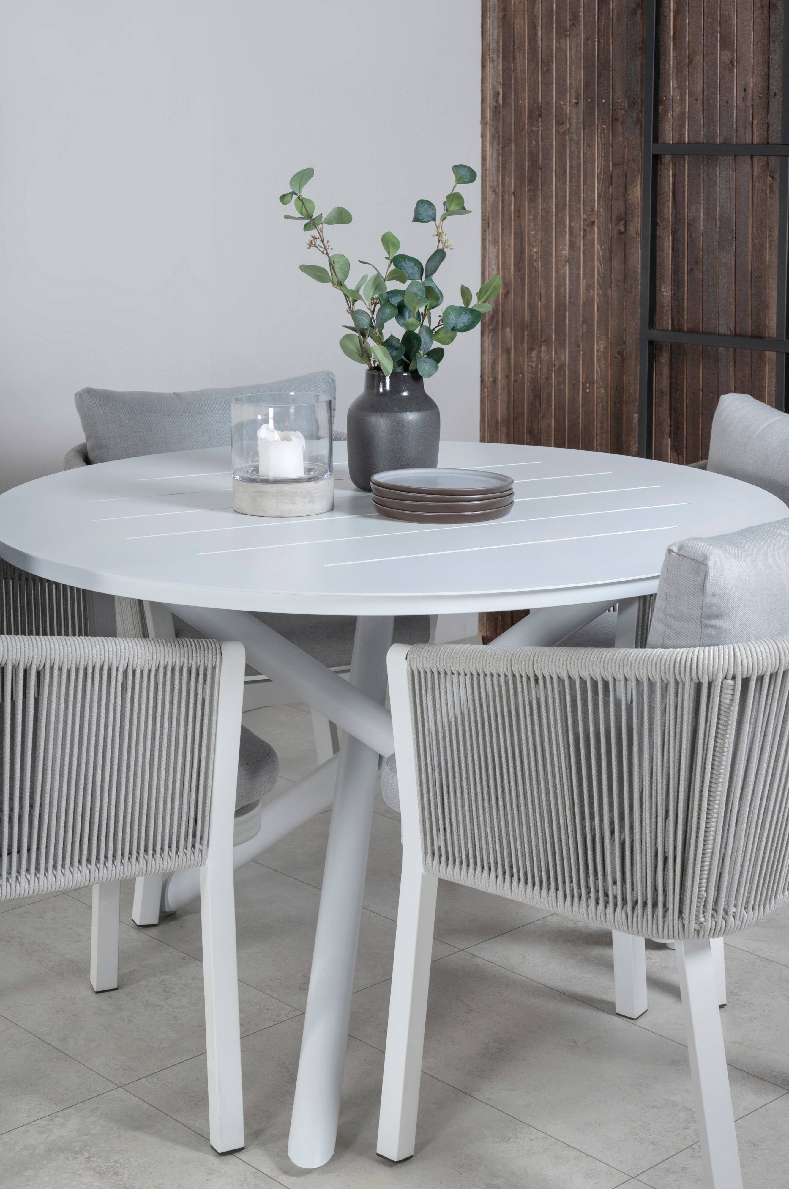Skab den perfekte moderne loungestil på din terrasse denne sommer! Virya-spisebordsstolene har et behageligt design med et afslappet udtryk i reb med let skrå aluminiumsben. Her sammen med Alma spisebordet med robust krydsstel i aluminium. Lad denne runde spisegruppe pryde din terrasse og forlænge sommermiddagens timer!