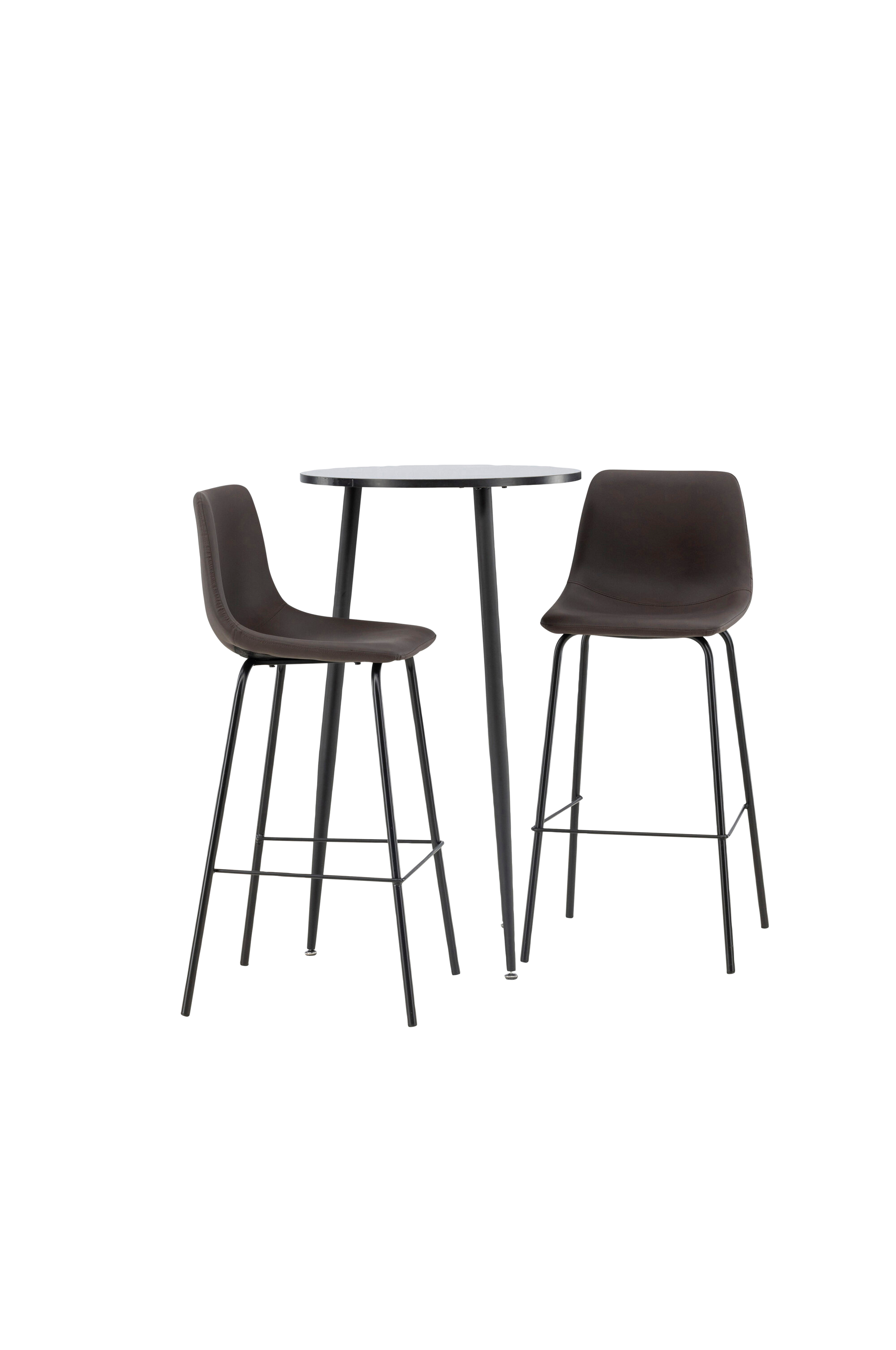 En behagelig bargruppe i stilrent design! Det vidunderlige Plaza barbord har en rund bordplade i MDF og bordbenene er let skråtstillede i metal. Her i flot kombination med barstole fra serien Alexi. Designet er gennemtænkt med en fuldpolstret stol i polstret polyurethanlæder og polyester og et smalt benstativ i pulverlakeret metal med integreret fodstøtte for ekstra komfort. Indret dit hjem smart!