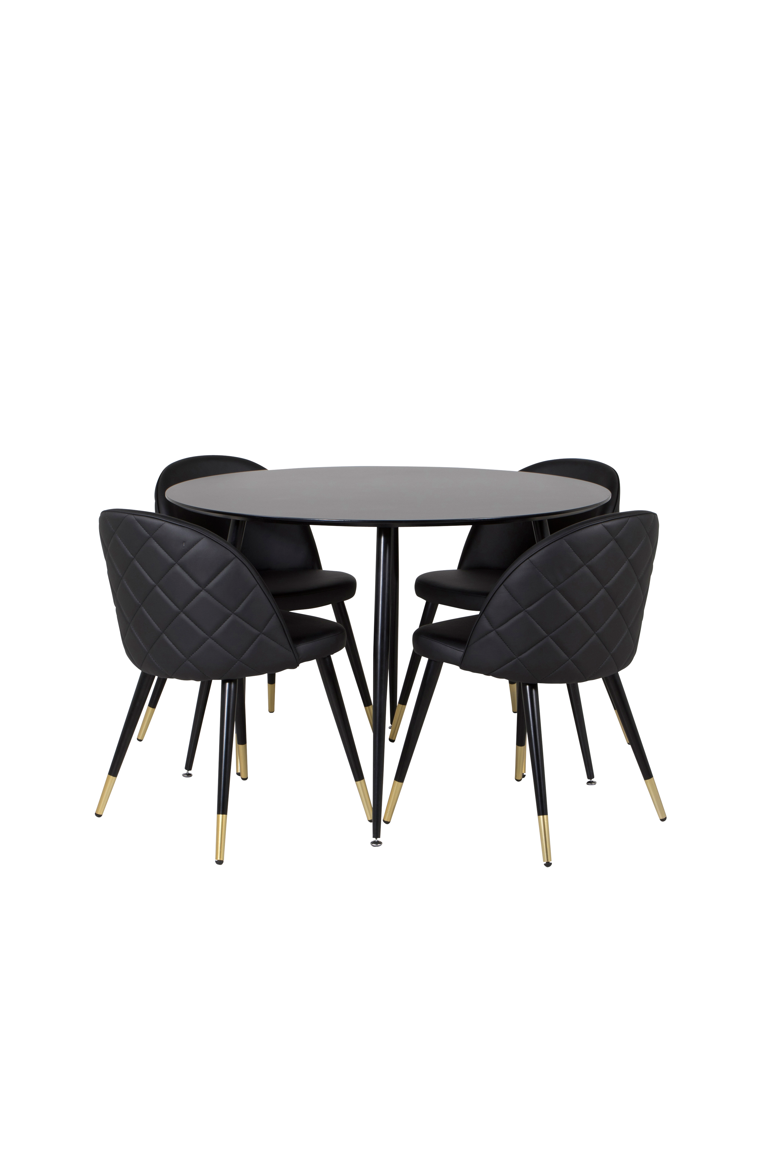Silar spisebord med en rund bordplade i MDF og bordben i metal. Matches med 4 Velvet spisebordsstole med sæde i kunstlæder og stoleben i metal. Bord og stole kræver let montering. Bordets mål: Diameter: 100 cm, højde: 75 cm. Stolenes mål: Siddebredde: 41 cm, siddedybde: 42,5 cm, siddehøjde: 46,5 cm.