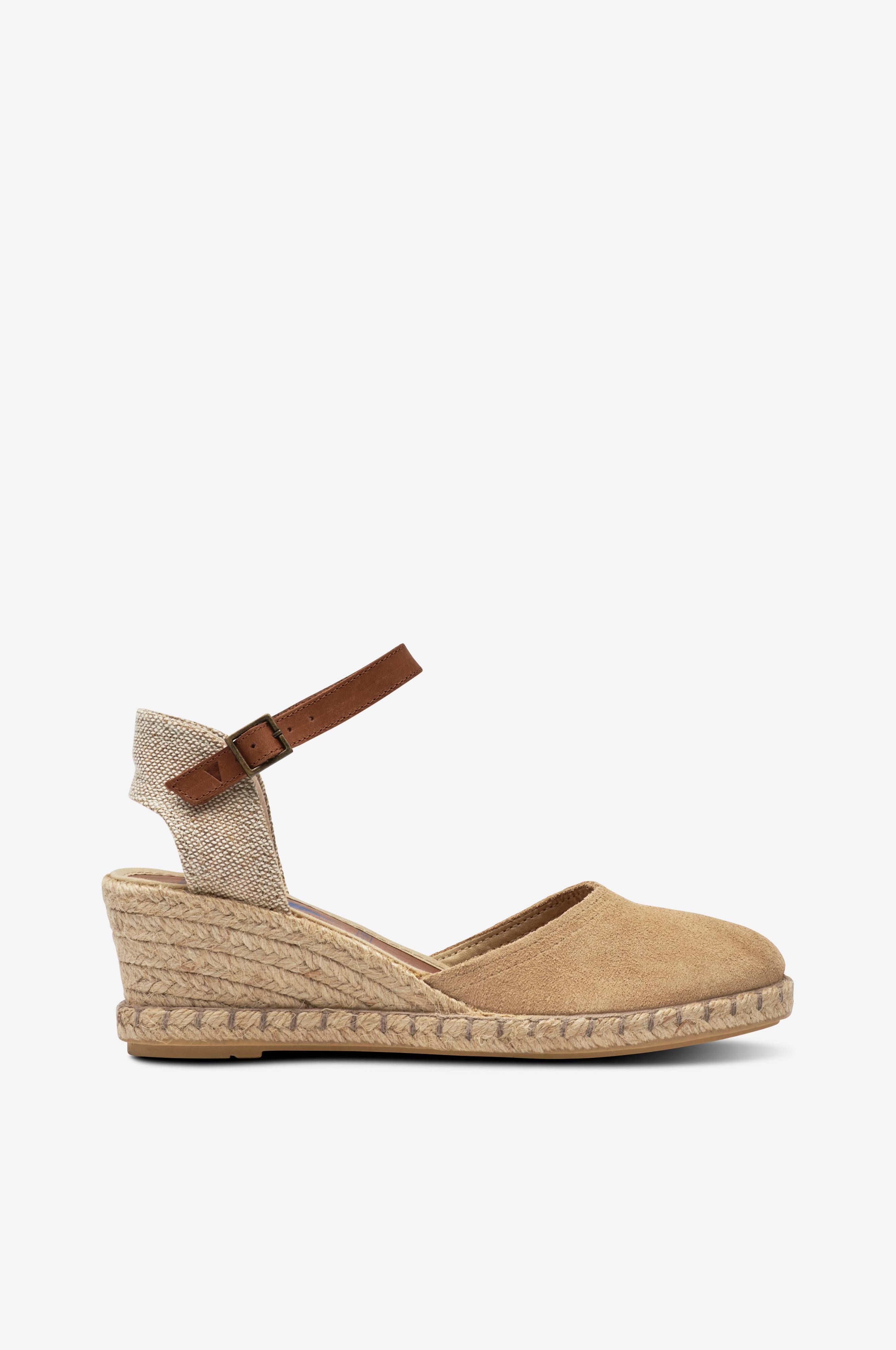• Dækket snude i ruskind• Justérbar rem i læder• Bred rem i tekstil bagpå• Rebbeklædt wedgehæl• Hælhøjde: 6 cm