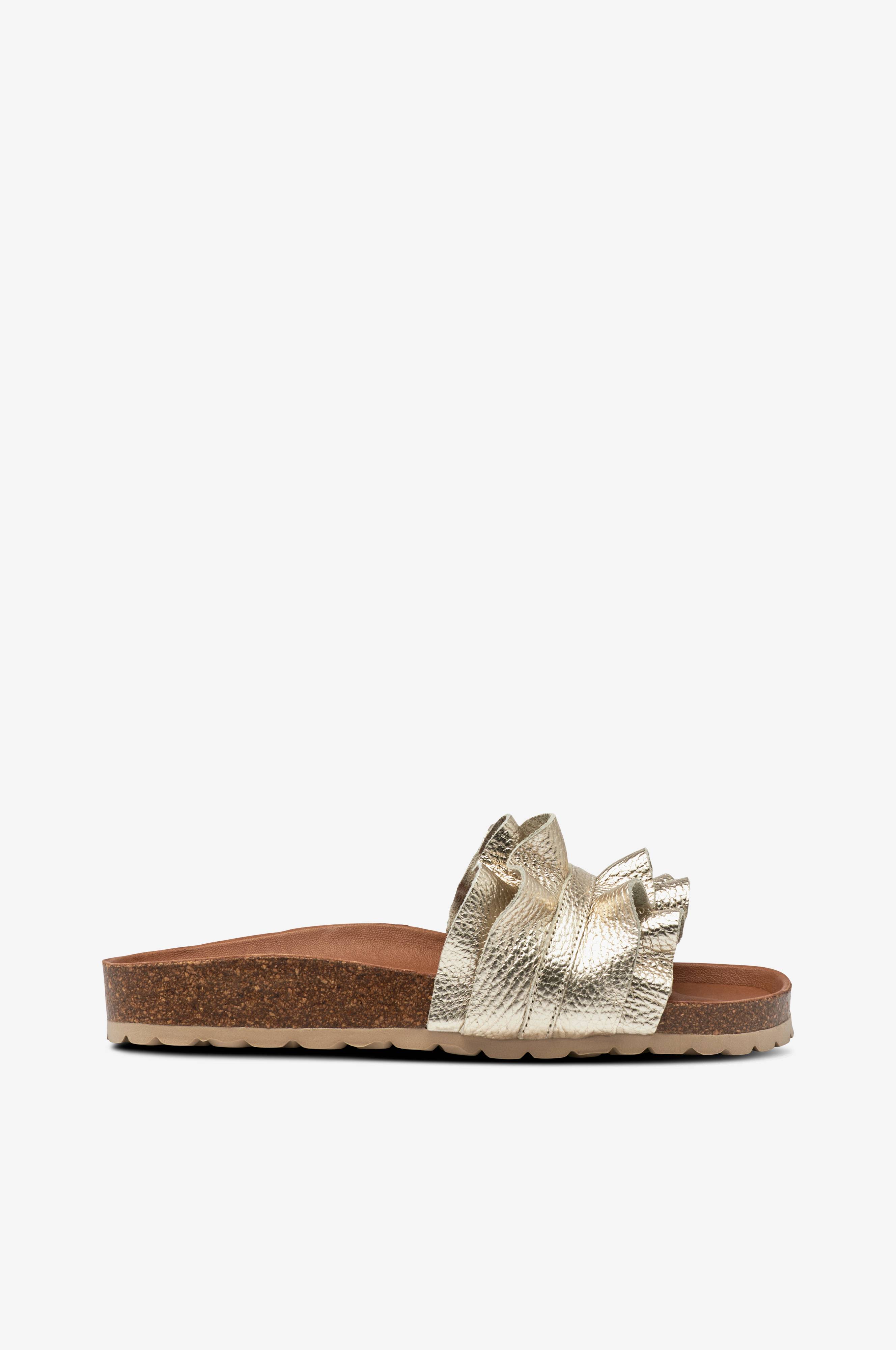 • Rem i guldfarvet læder med volantdetaljer• Mellemsål i kork