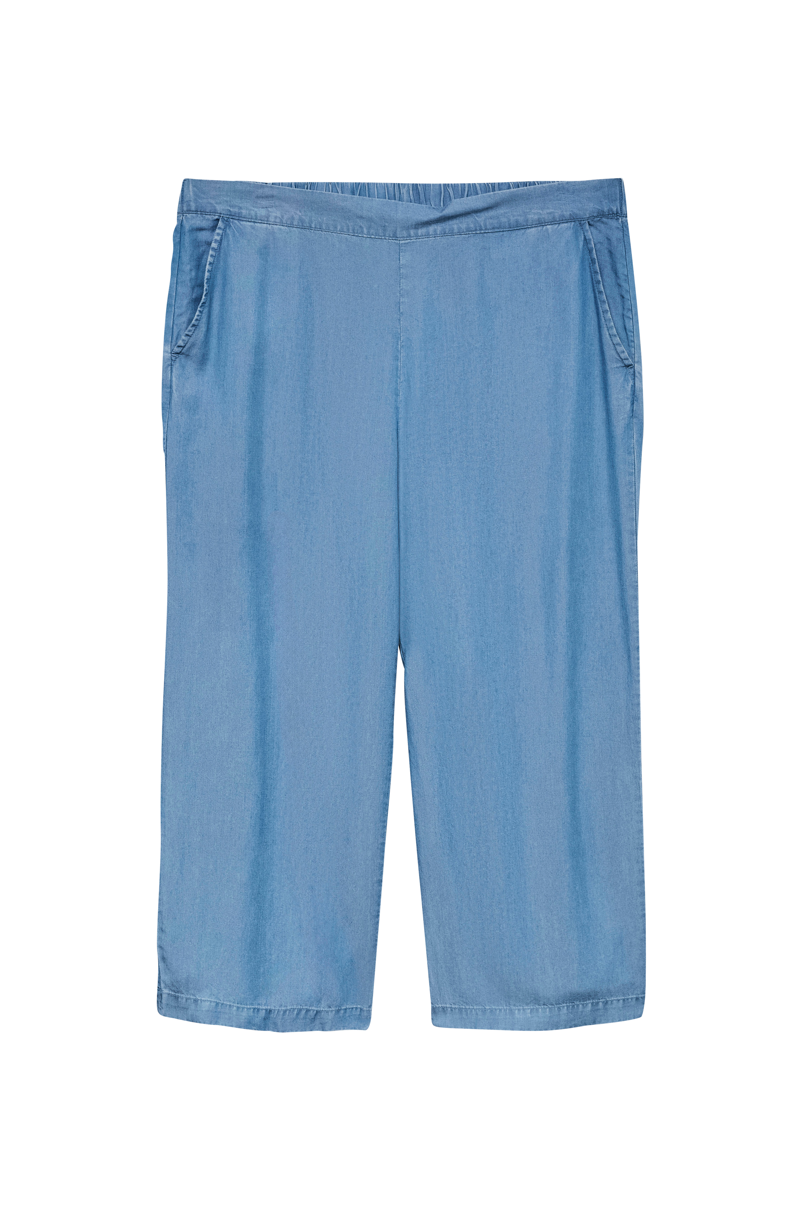 • Culottedesign med brede, lige ben• Linning med elastik bagpå• Lommer foran• Fremstillet af blødt denim• Indre benlængde: 61 cm i størrelse 44/32
