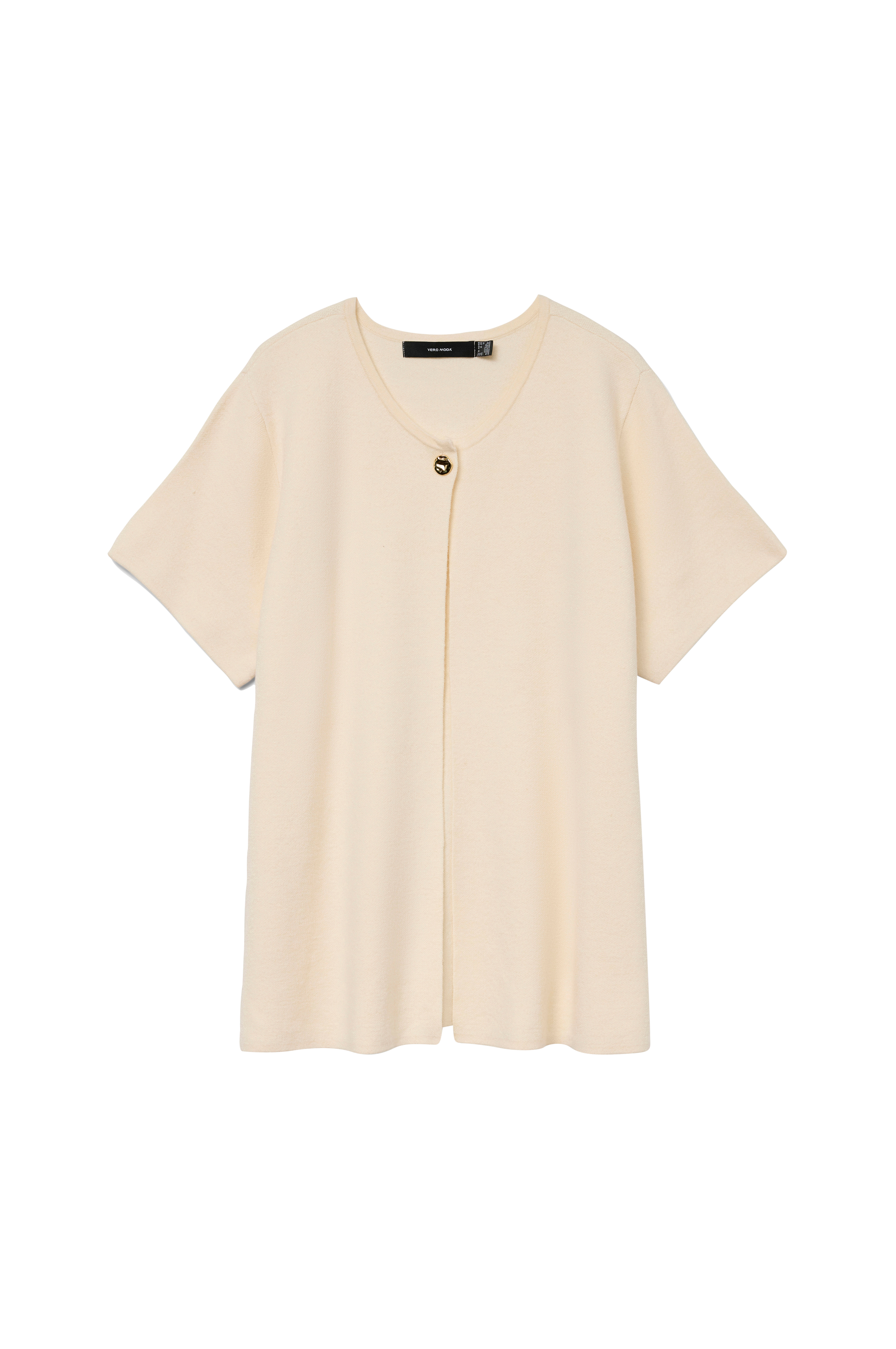 • Kortærmet, fintstrikket cardigan• Rund halsudskæring• En guldfarvet, dekorativ knap på udskæringen• Store størrelser
