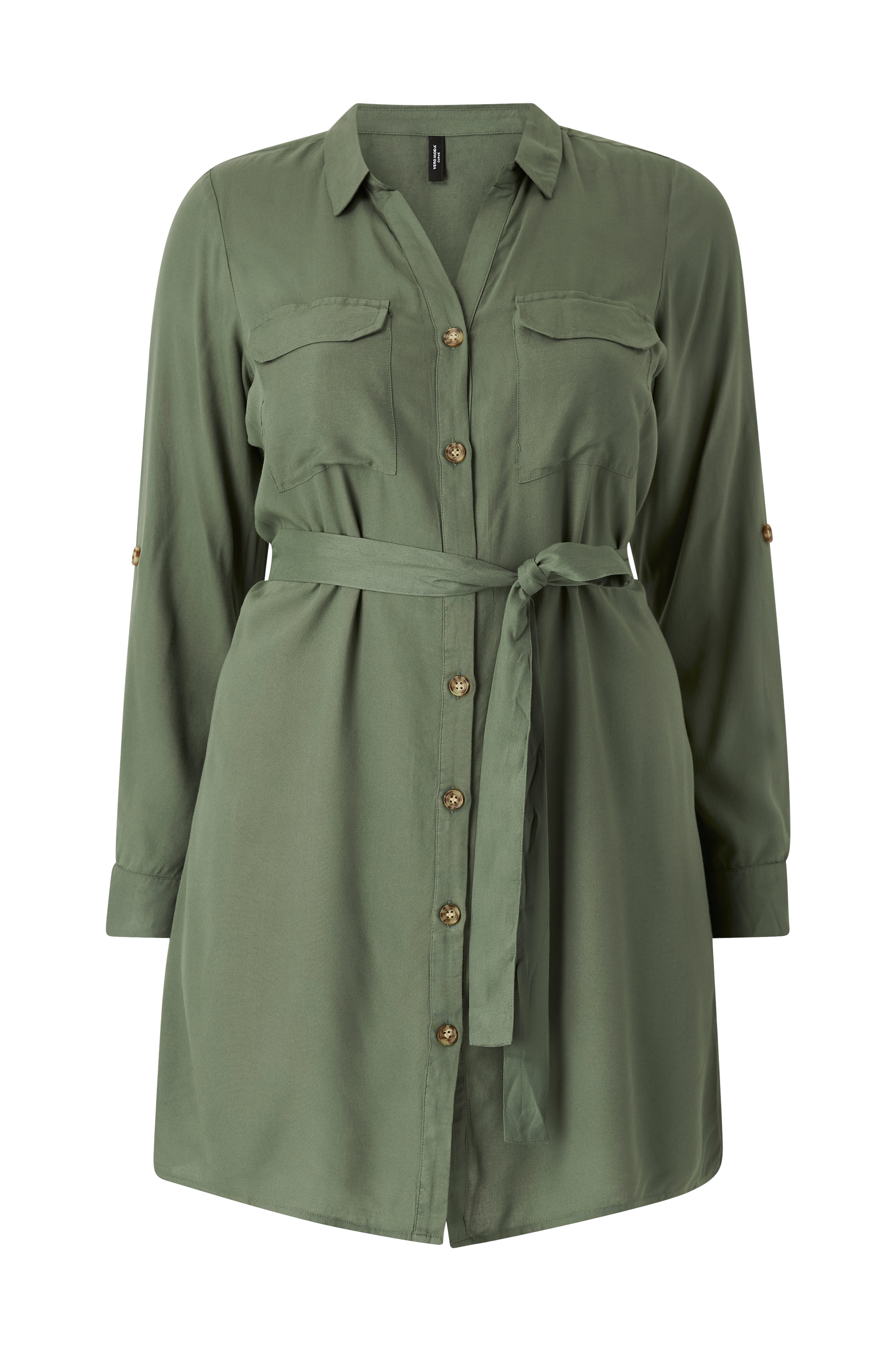 • Skjortekjole i viskose • To brystlommer • Løst bæltespænde • Knap ved manchetterne • Opfoldende ærmer • Store størrelser • Længde: 96 cm i størrelse 44
