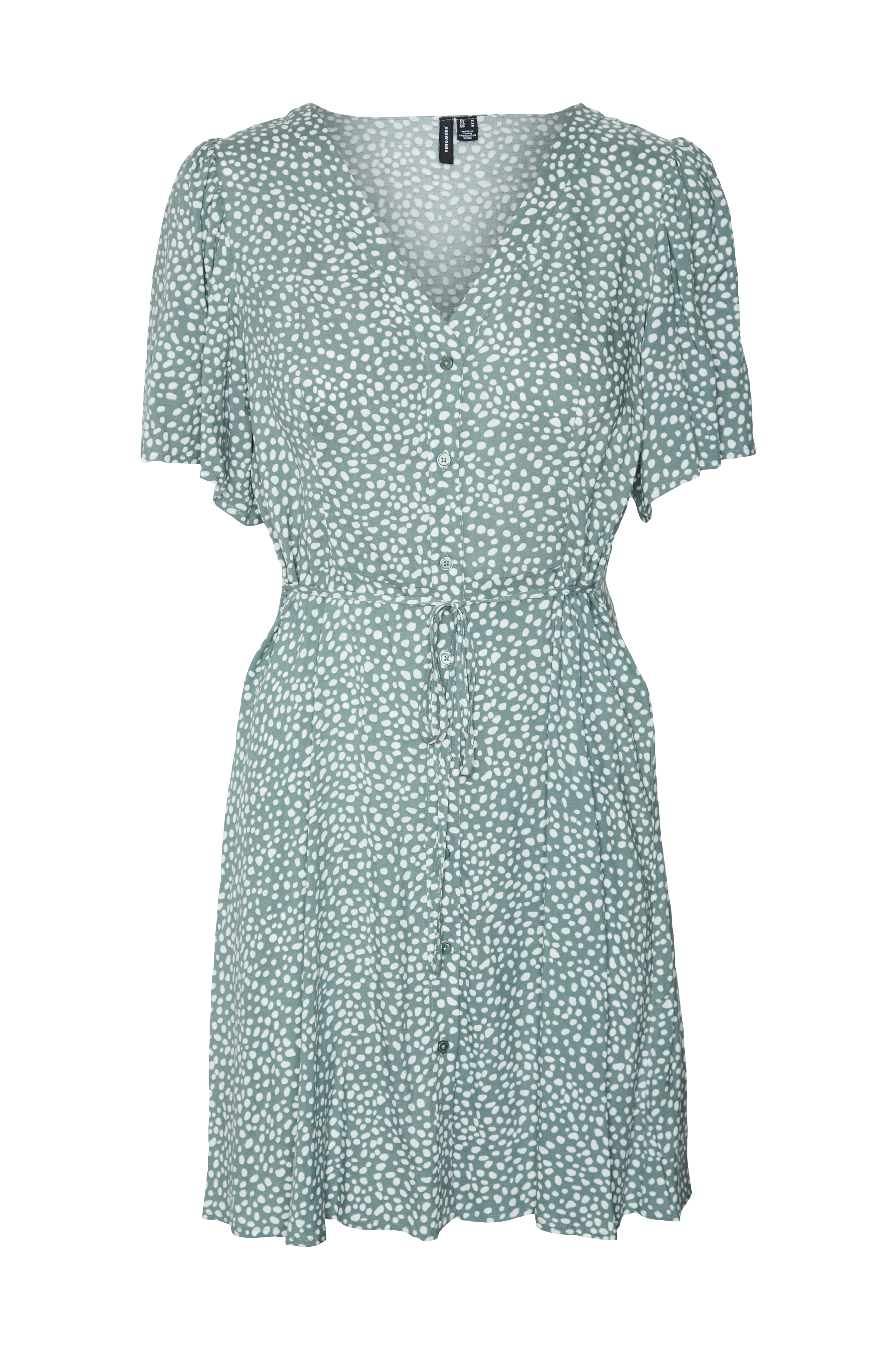 • Kjole i viskose• V-formet halsudskæring• Korte, brede ærmer• Knapper langs forsiden• Bindebånd ved taljen• Store størrelser• Længde: 98 cm i størrelse 42