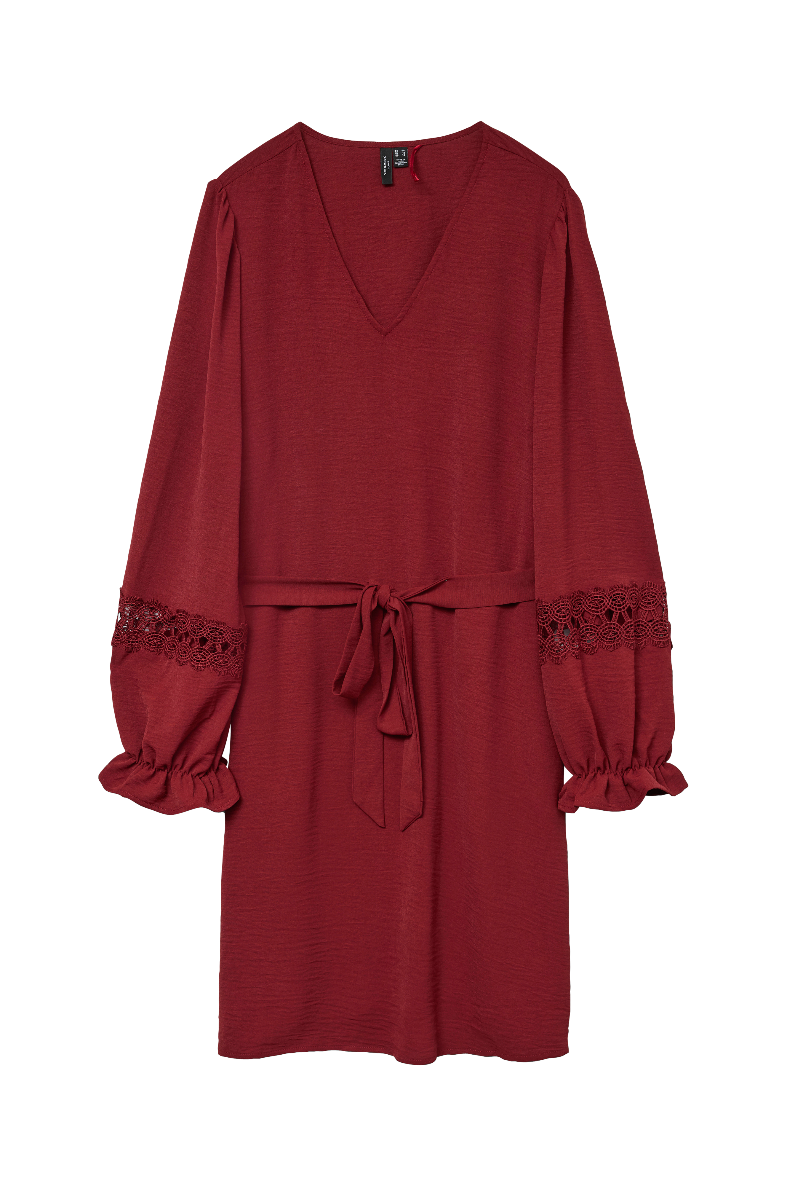 • Kort kjole med afslappet pasform• V-formet halsudskæring• Lange ærmer med blondedetaljer nederst• Elastik• Aftageligt bindebælte ved taljen• Længde: 96 cm i størrelse 44• Plusstørrelser