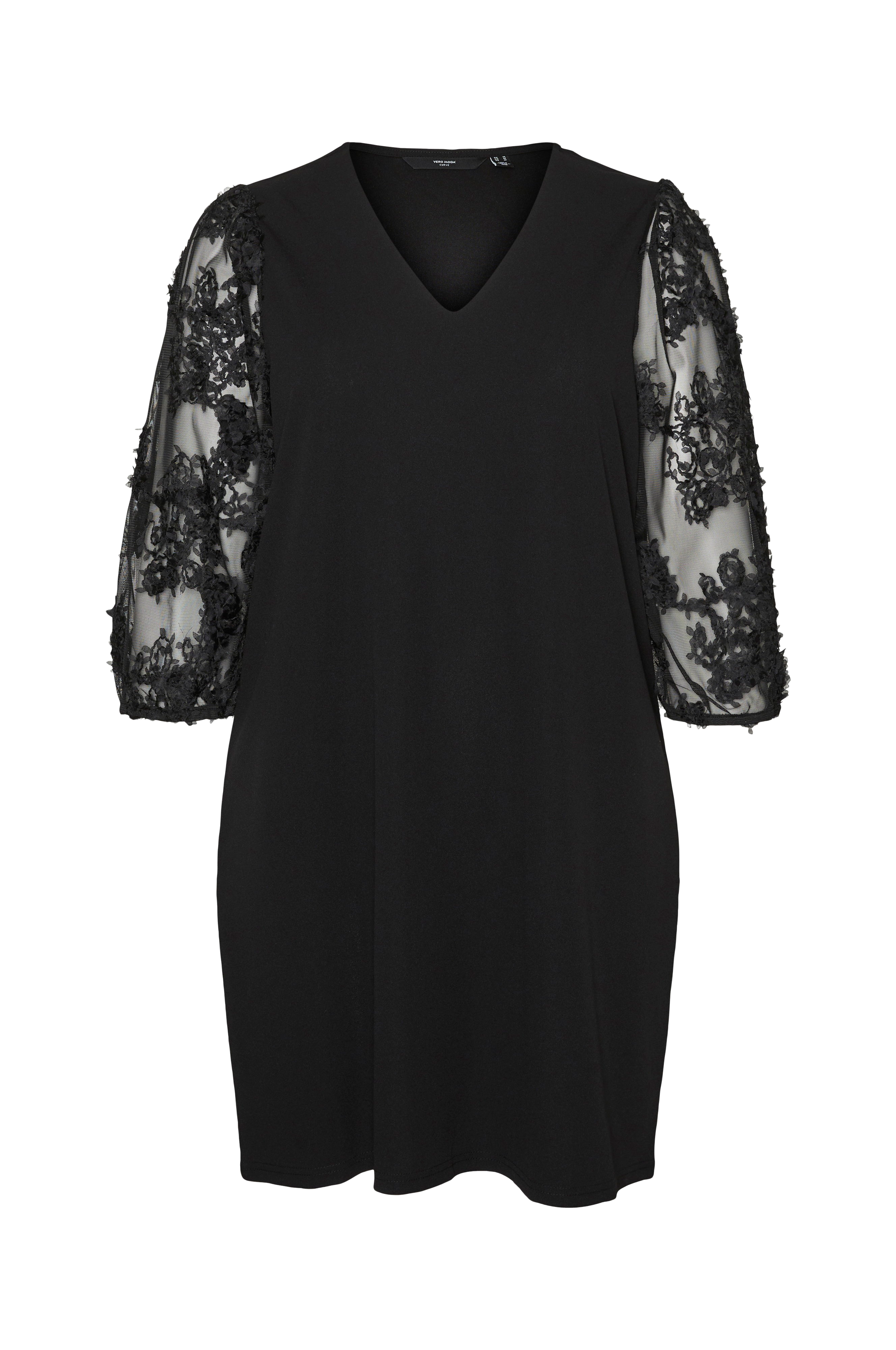 • Kjole i elastisk jersey• V-formet halsudskæring• 3/4 lange ærmer i transparent mesh med blomstrede strukturmønstre• Elastik ved manchetterne• Store størrelser• Længde: 99 cm i størrelse 42/44